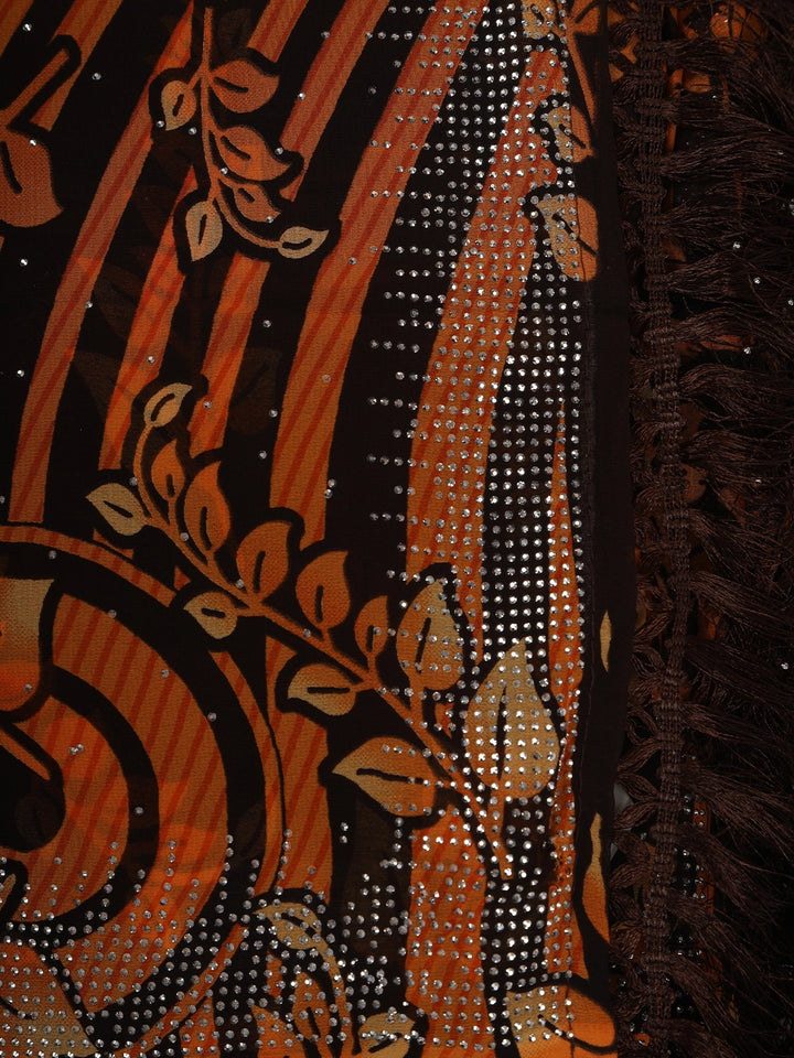 Brown and Orange Floral Printed Design Chiffon Saree with Stone Embellished Border