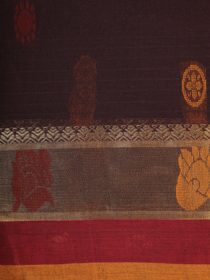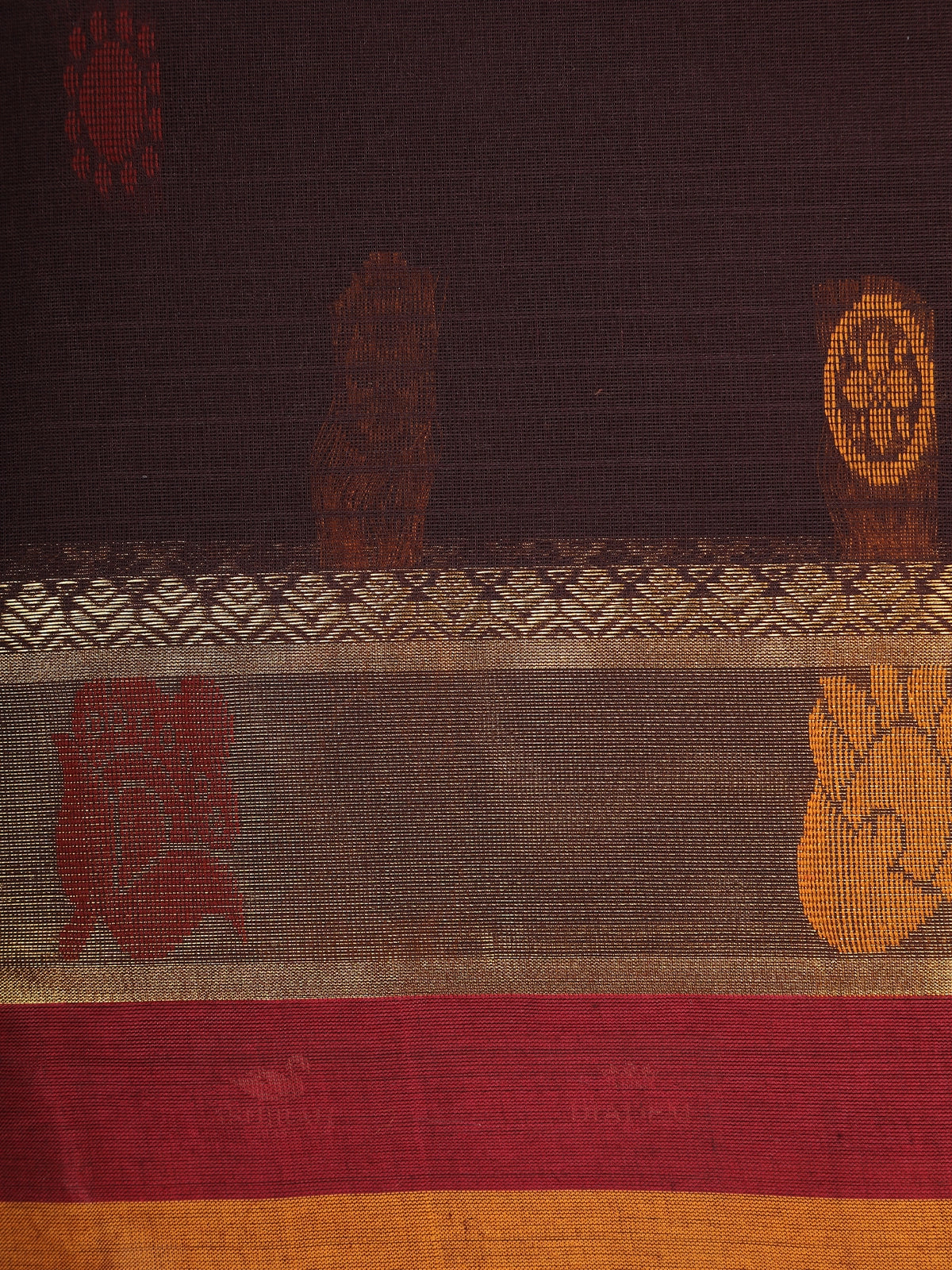 Brown Butta Design Cotton Saree with Contrast Red and Mustard Zari Border