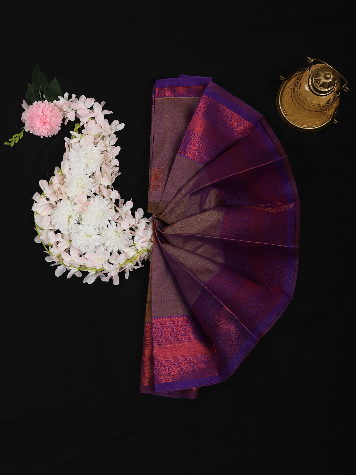 The saree is highlighted by a rich purple contrast border, intricately woven with classic floral and traditional motifs that add depth and a heritage-inspired finish. Subtle zari accents lend a gentle sheen, while the premium soft silk fabric ensures a smooth texture, elegant fall, and comfortable drape throughout the day.
