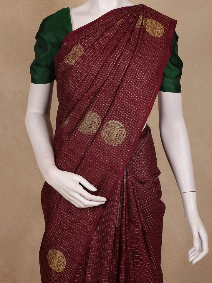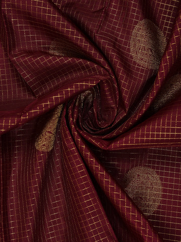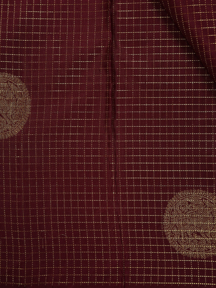 Elevate your ethnic charm with this Brown Checked Woven Kanchipuram Silk Saree, a stunning blend of tradition and sophistication. The saree features an elegant brown body with intricate checked patterns, showcasing the timeless beauty of handwoven craftsmanship. Each check is highlighted with subtle zari threads, adding a gentle shimmer that enhances its luxurious appeal.