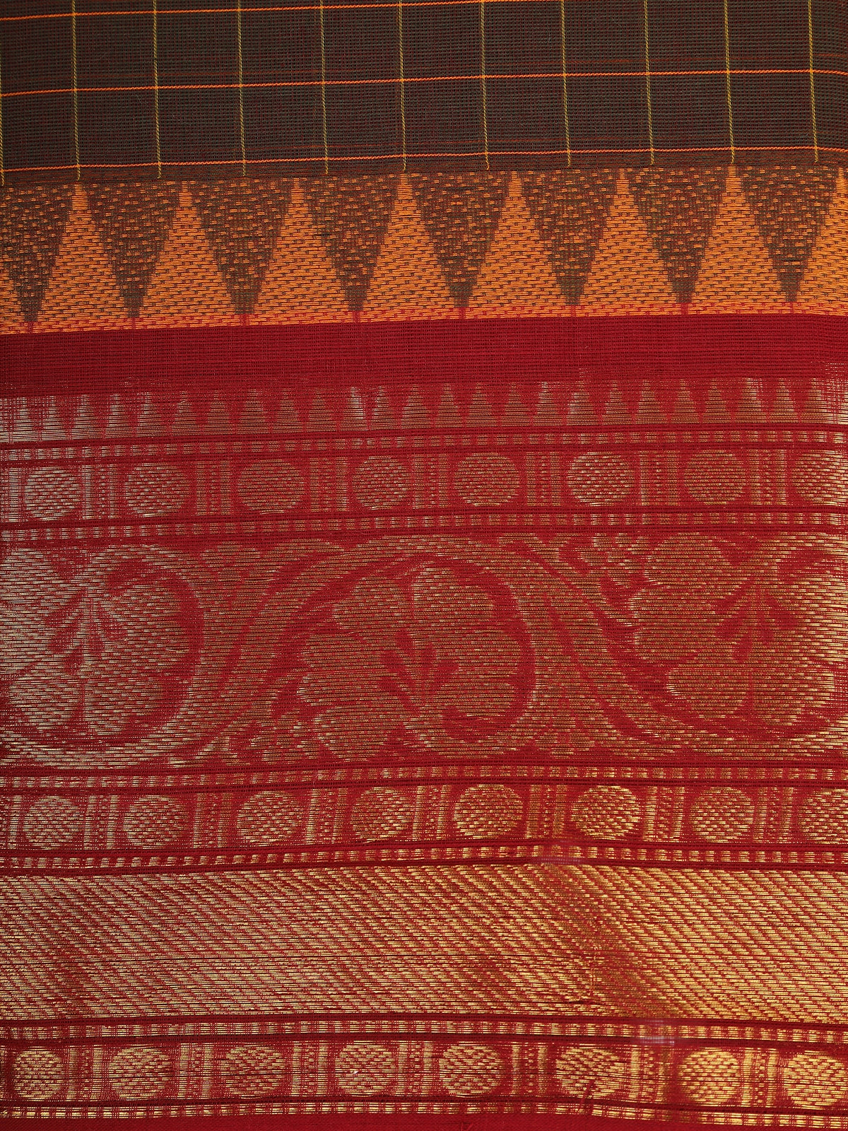Brown Checks Design Cotton Saree with Red Zari Woven Border