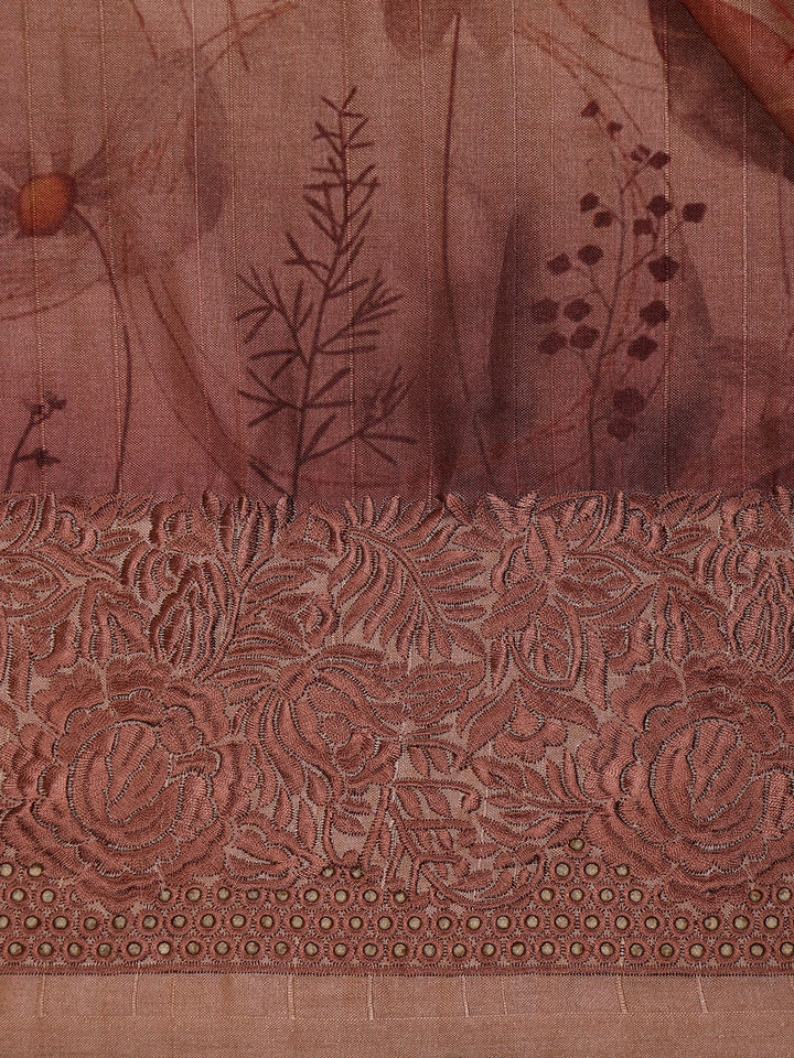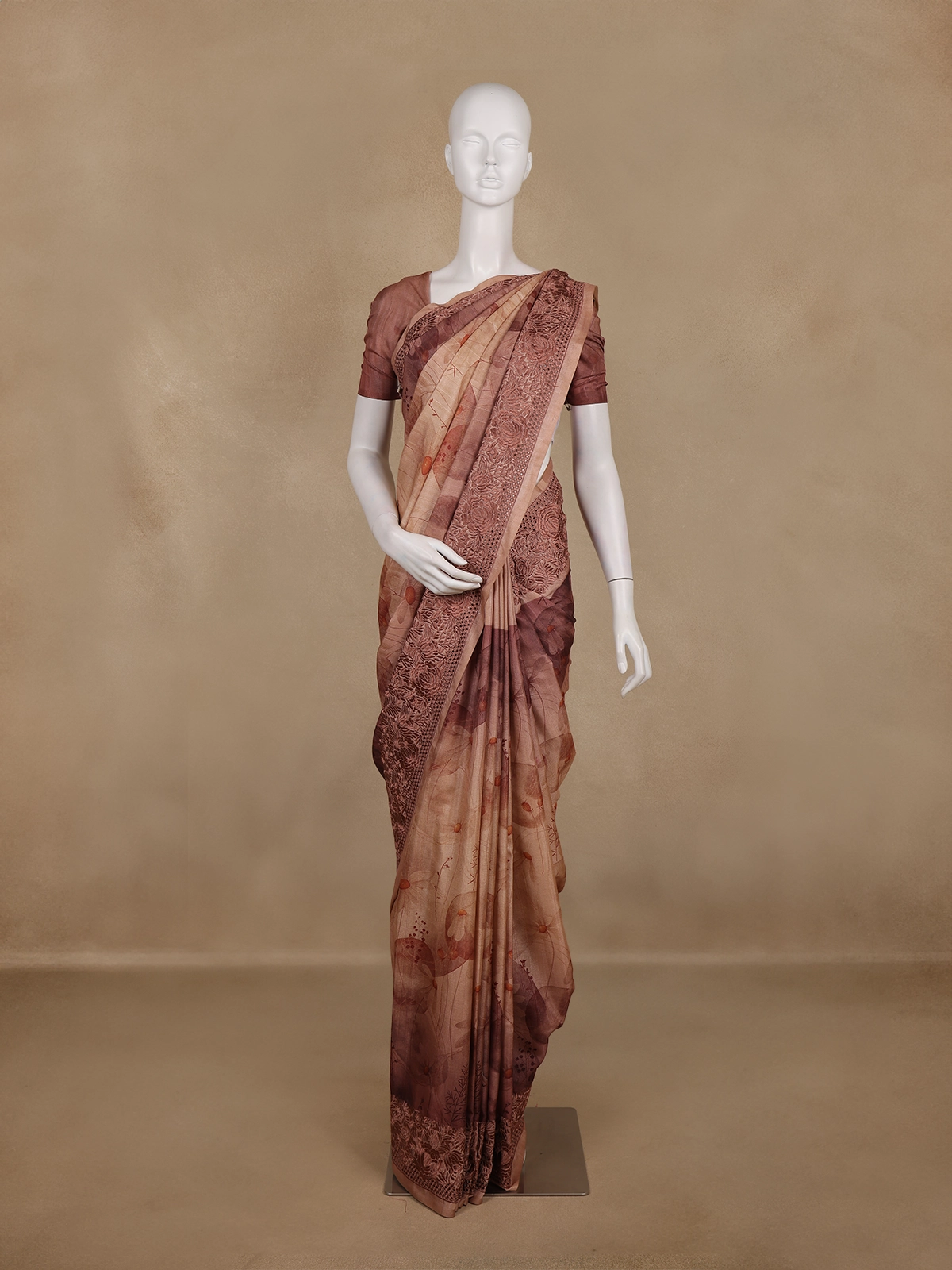 The soft brown hue beautifully complements the intricate embroidered border, adding a subtle shimmer that enhances the saree’s sophisticated appeal. The matching brown blouse and pallu maintain a seamless look, ensuring balance and poise in every drape.