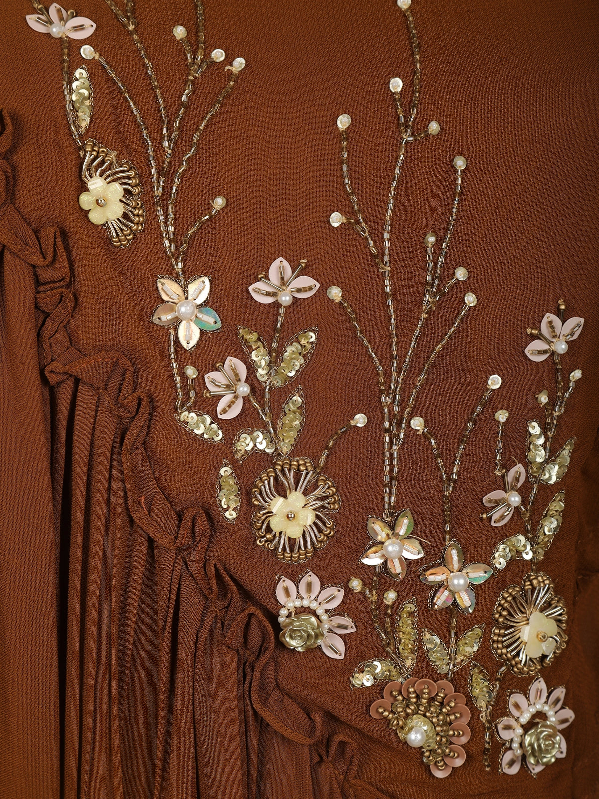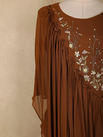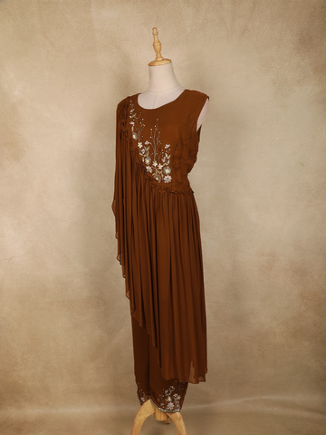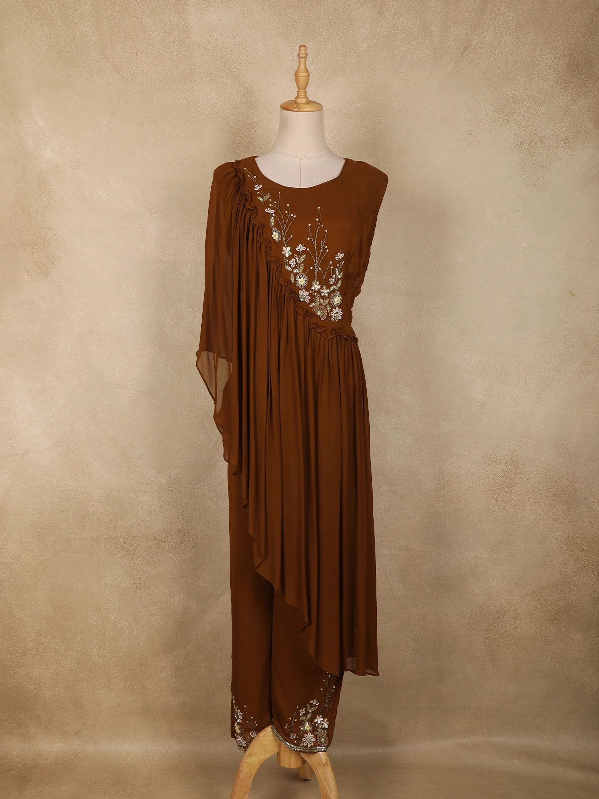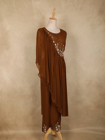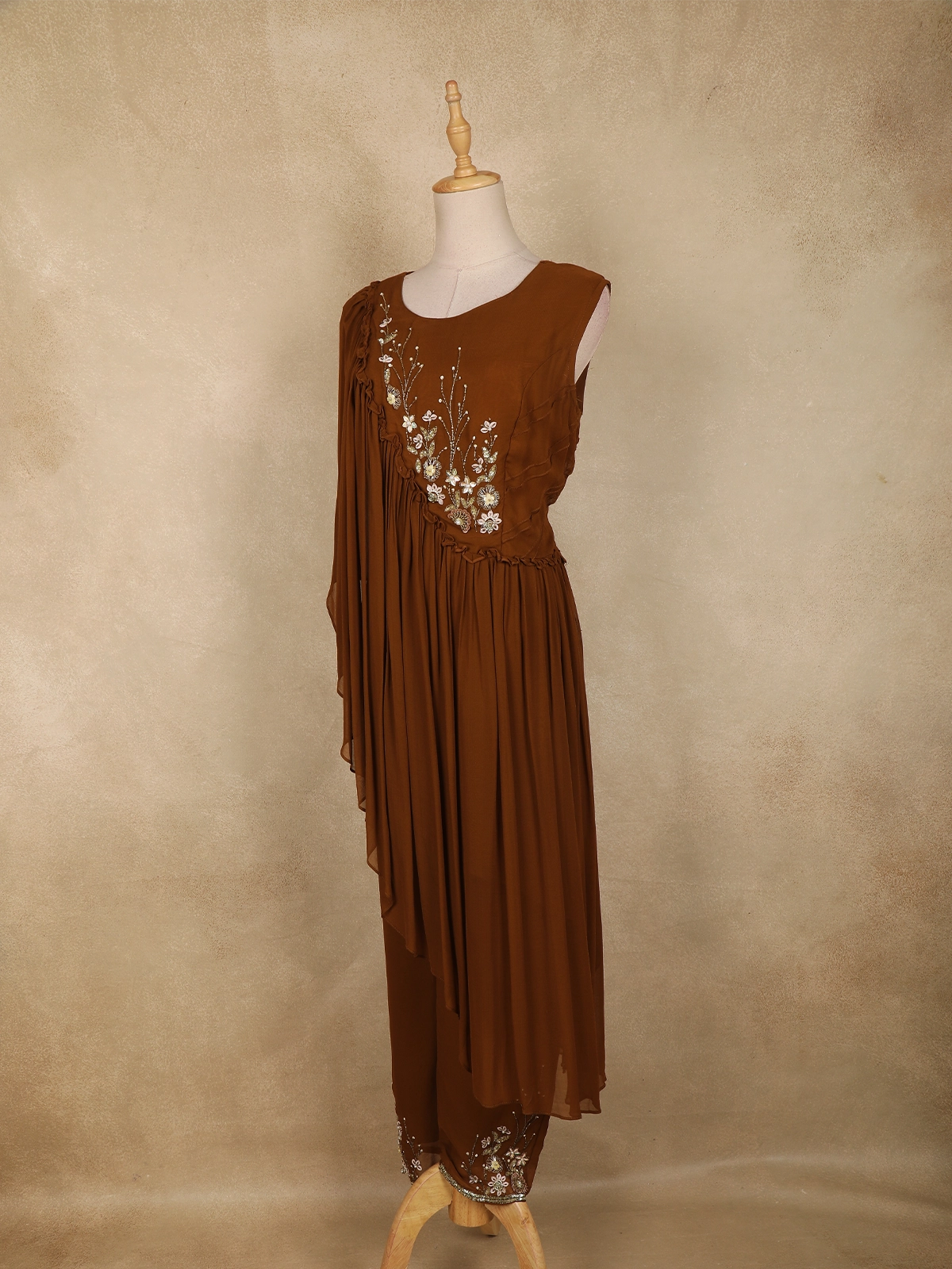 This brown georgette kurti is crafted to offer effortless elegance with a touch of festive charm. Made from lightweight georgette fabric, it features delicate floral embroidery accented with subtle sequins and bead detailing that adds a graceful shimmer without overpowering the look.