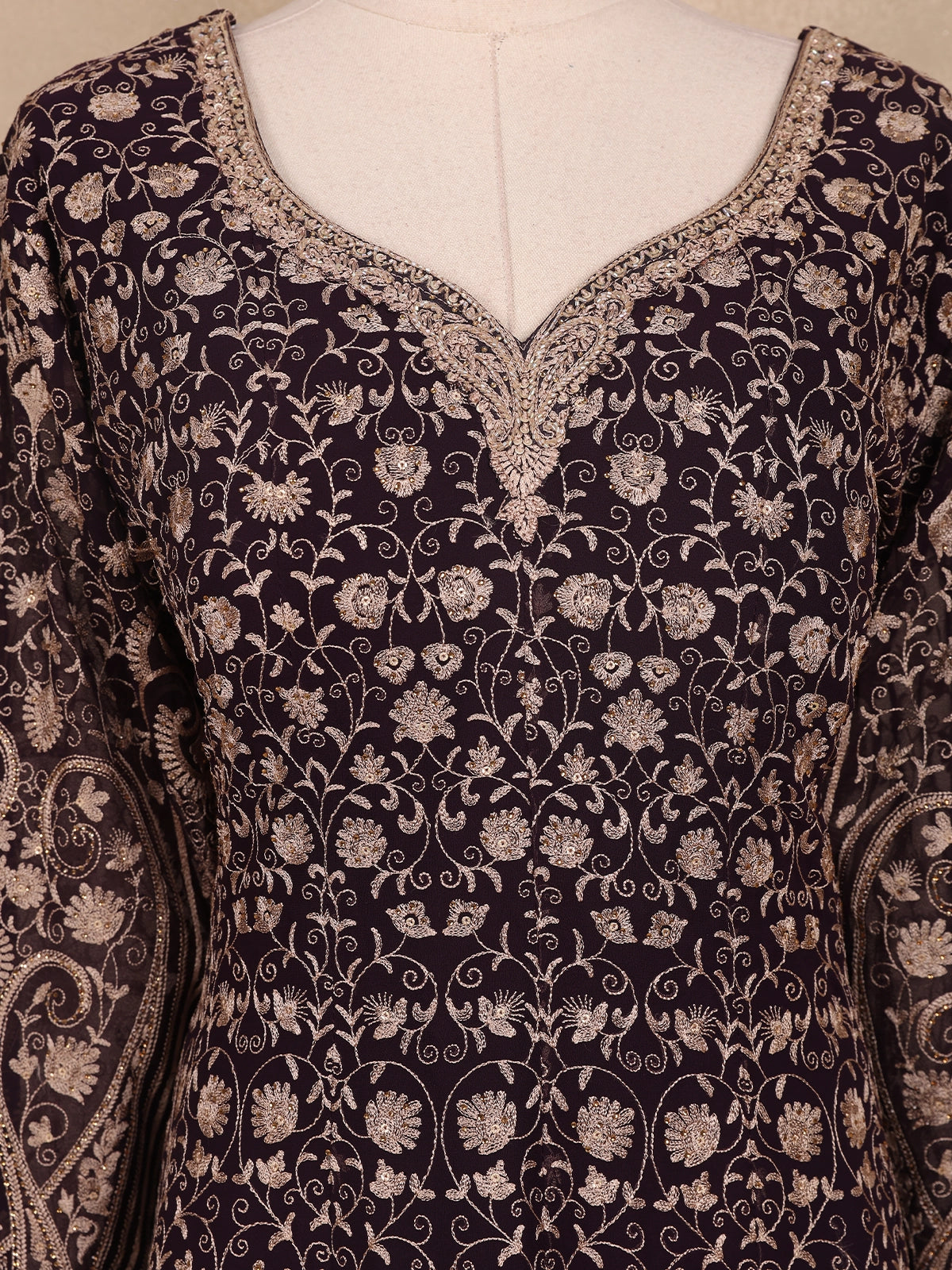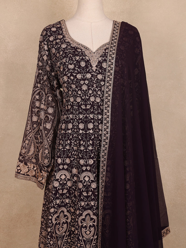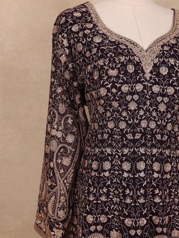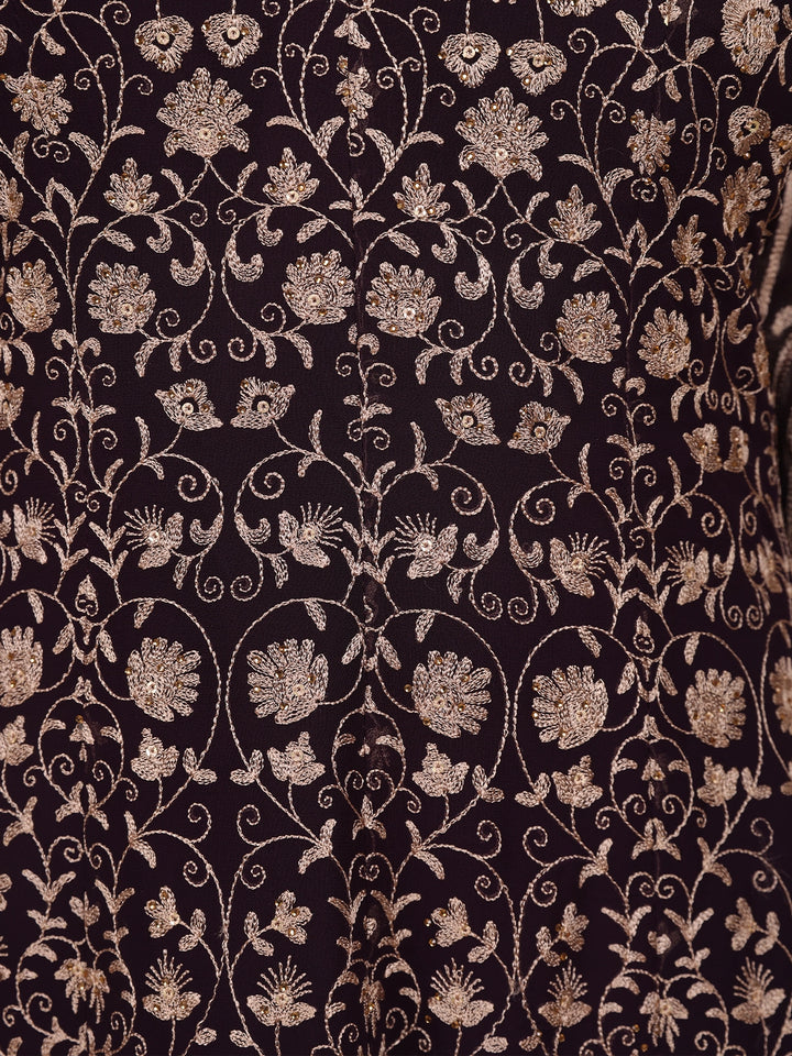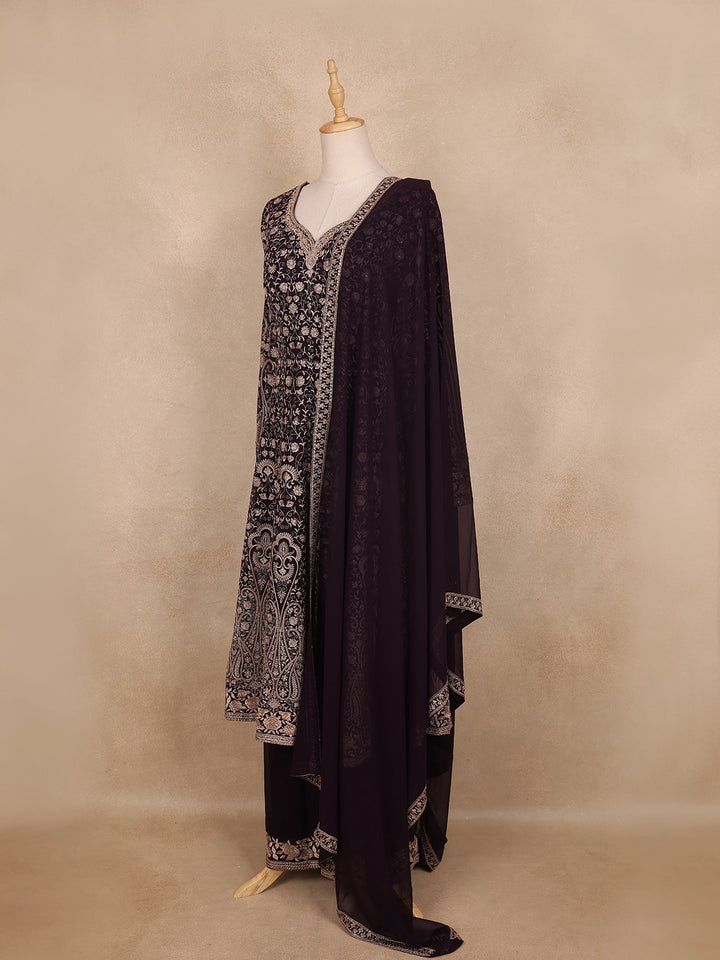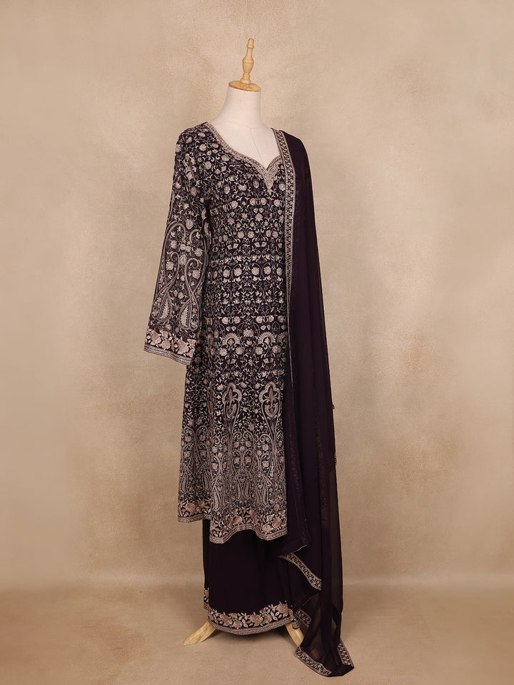 Step into festive elegance with this Brown Floral Embroidery Georgette Palazzo Suit, a stunning ensemble that blends grace with contemporary flair. The rich brown georgette fabric drapes beautifully, offering a soft, flowing silhouette perfect for special occasions.
