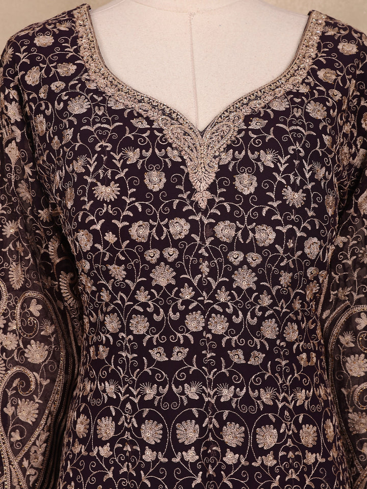 Brown Floral Embroidery Georgette Palazzo Suit