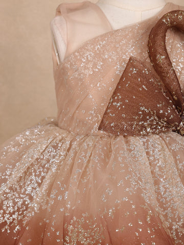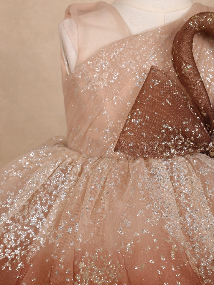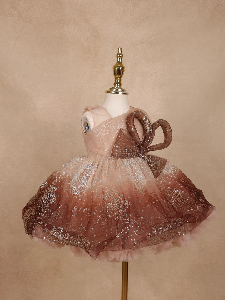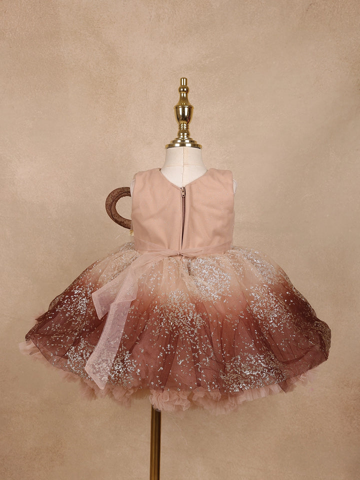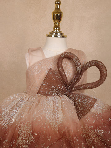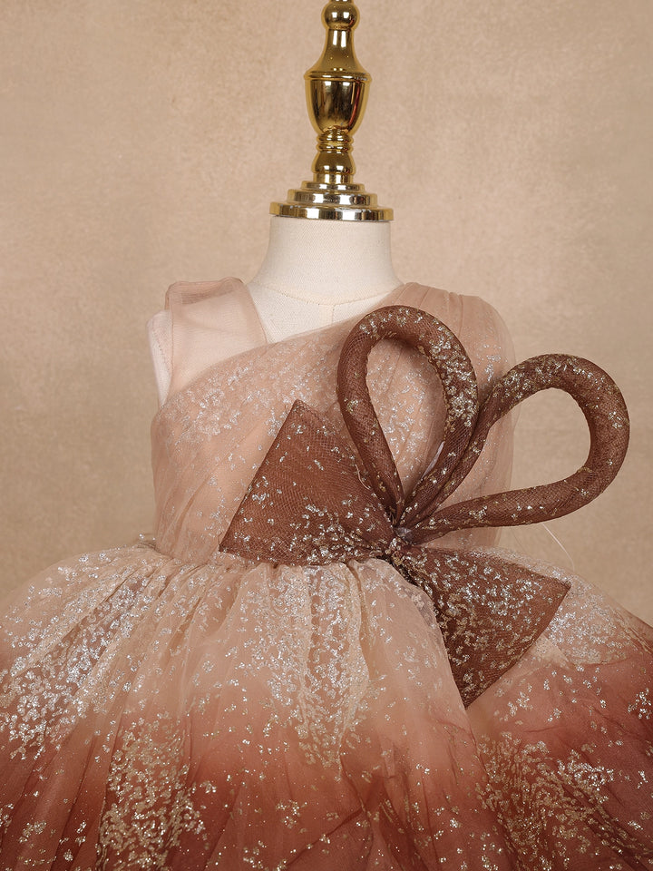 Let your little one sparkle with grace in this Brown Floral Glitter Design Party Wear Net Frock with Oversized Bow, a perfect blend of fairytale charm and modern elegance. Crafted from soft, premium-quality net fabric, this frock features a mesmerizing ombre brown hue beautifully dusted with silver glitter, creating a stunning shimmer effect under every light.