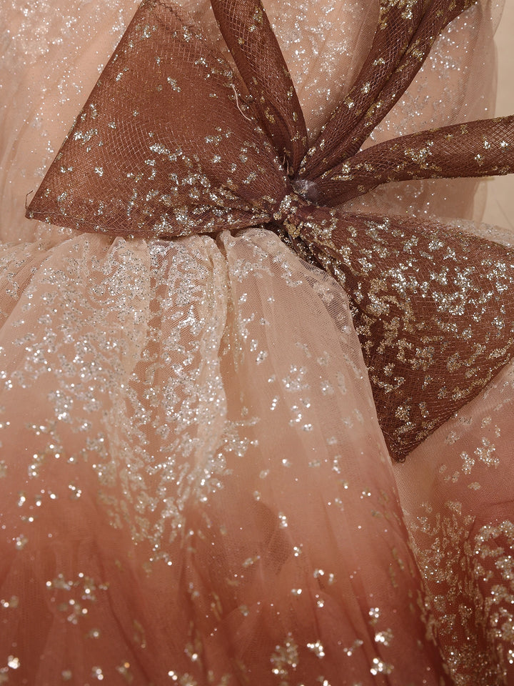 Brown Floral Glitter Design Party Wear Net Frock With Oversized Bow