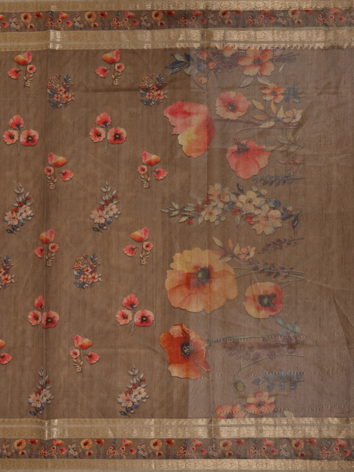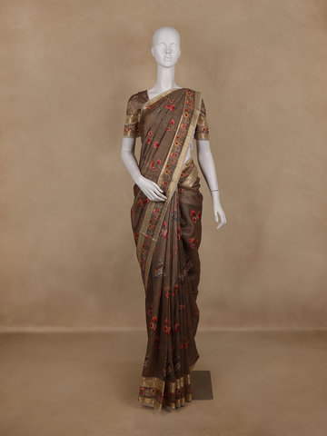 The warm coffee brown base is adorned with delicate floral prints in shades of red, peach, and beige, lending the drape a graceful charm. Its matching pallu and blouse piece create a harmonious look, while the zari border adds a subtle touch of opulence, perfect for women who appreciate understated luxury.