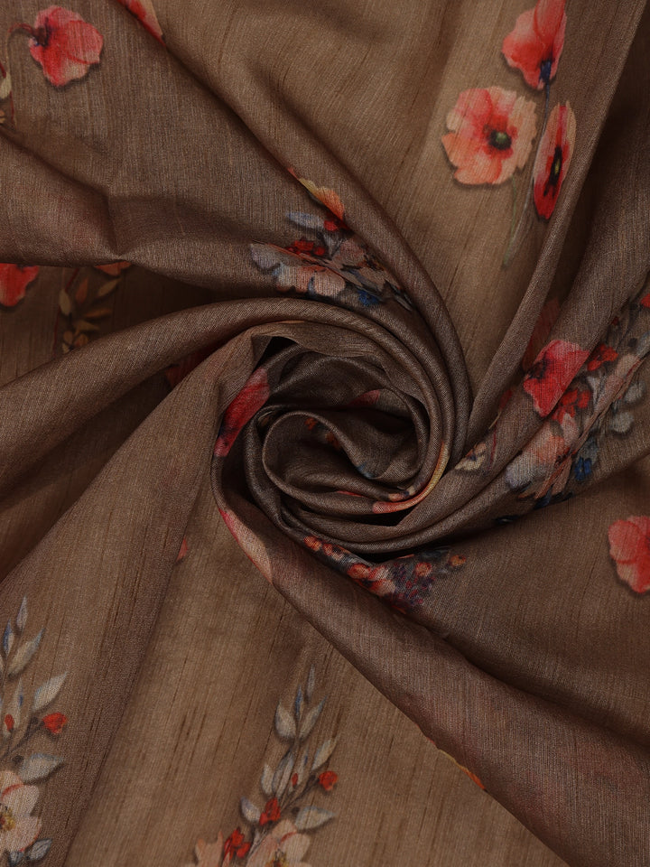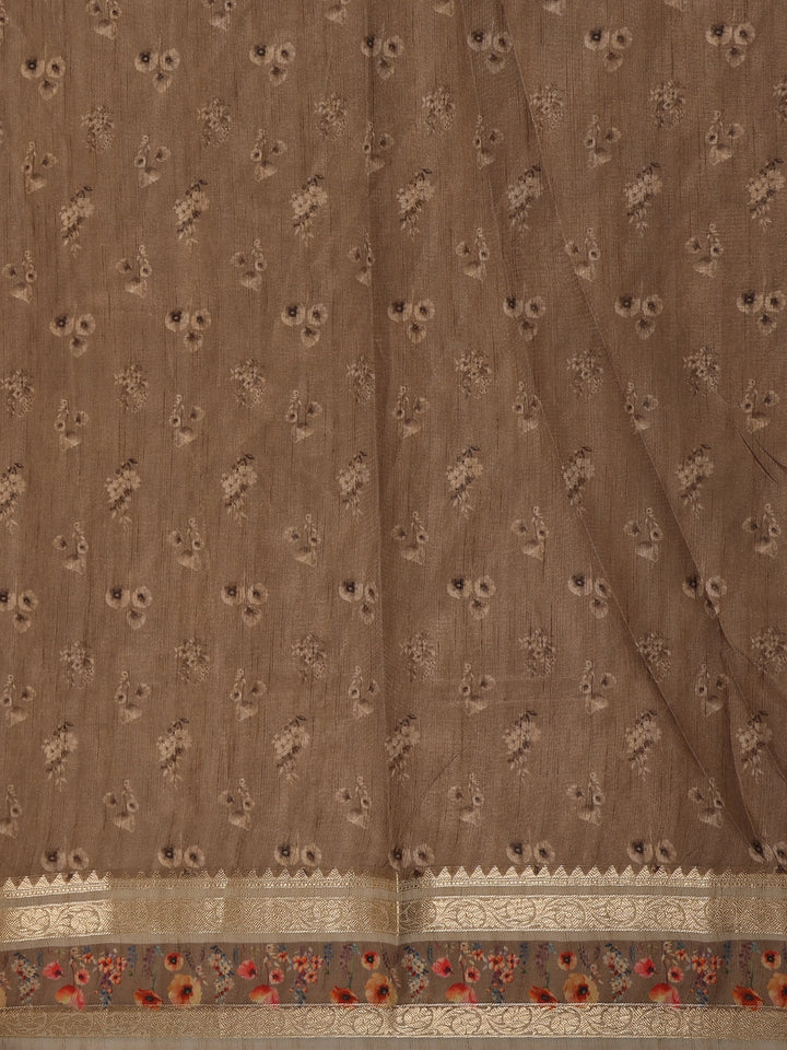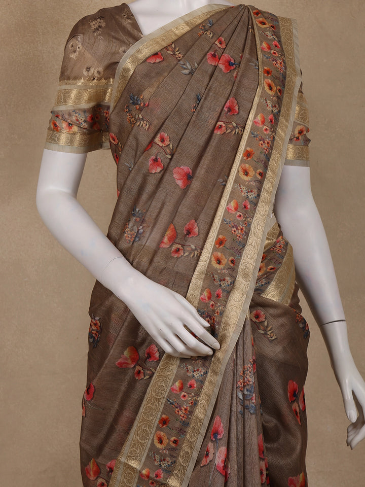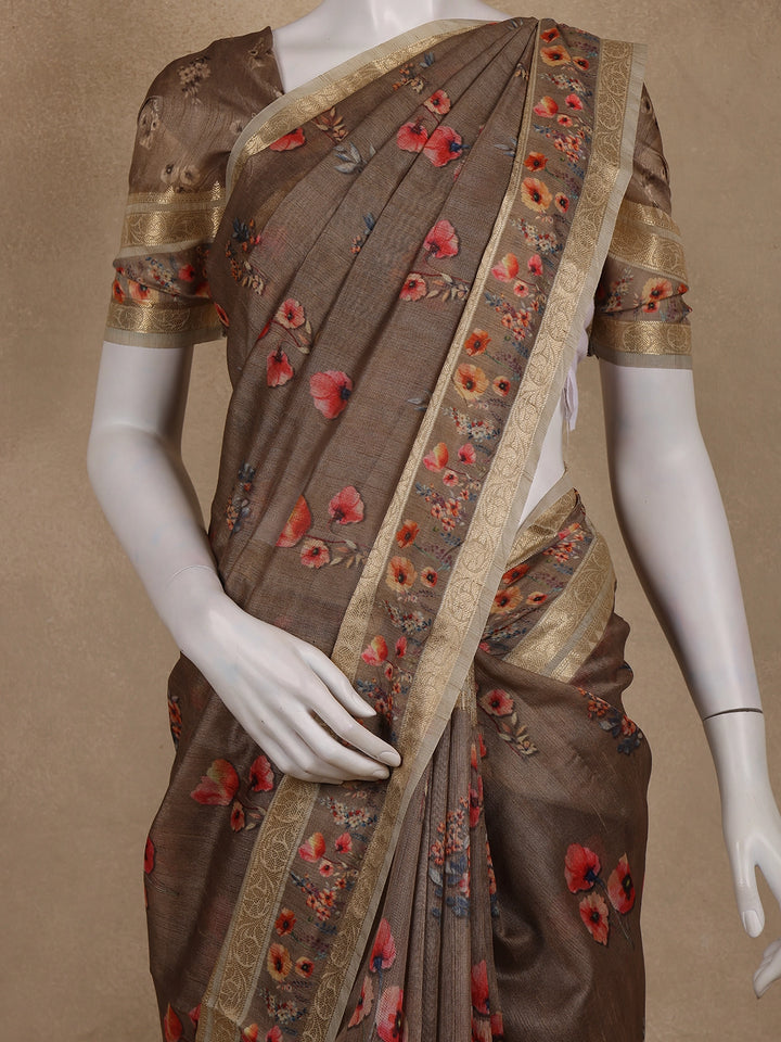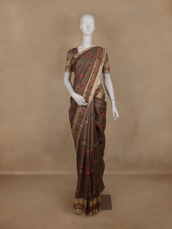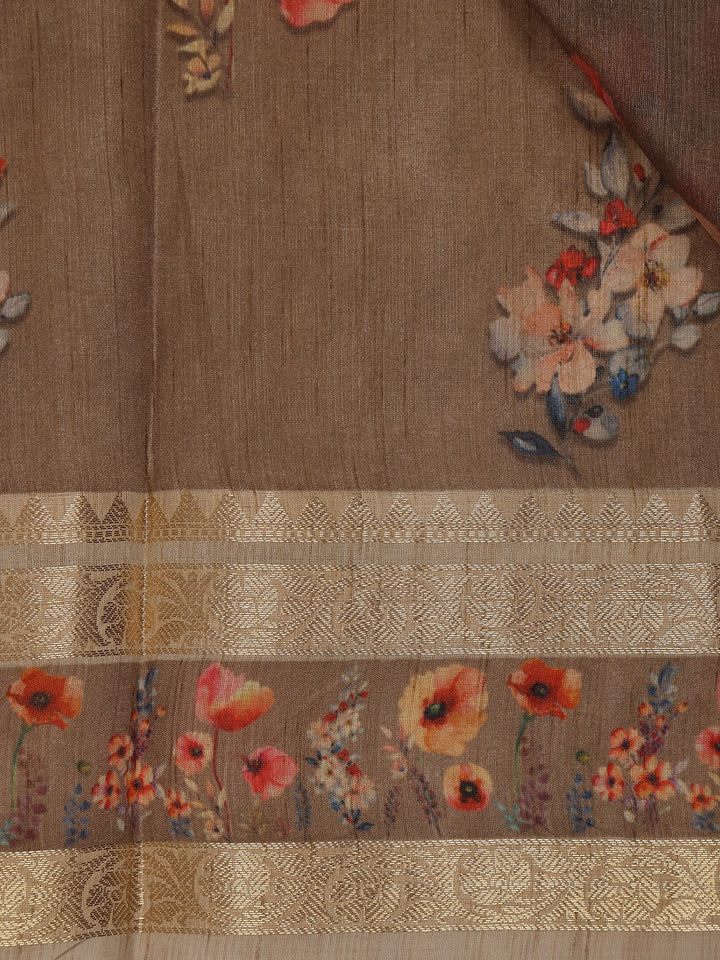 Brown Floral Printed Design Tussar Silk Saree