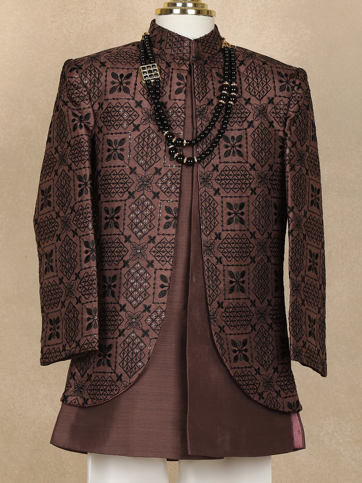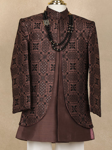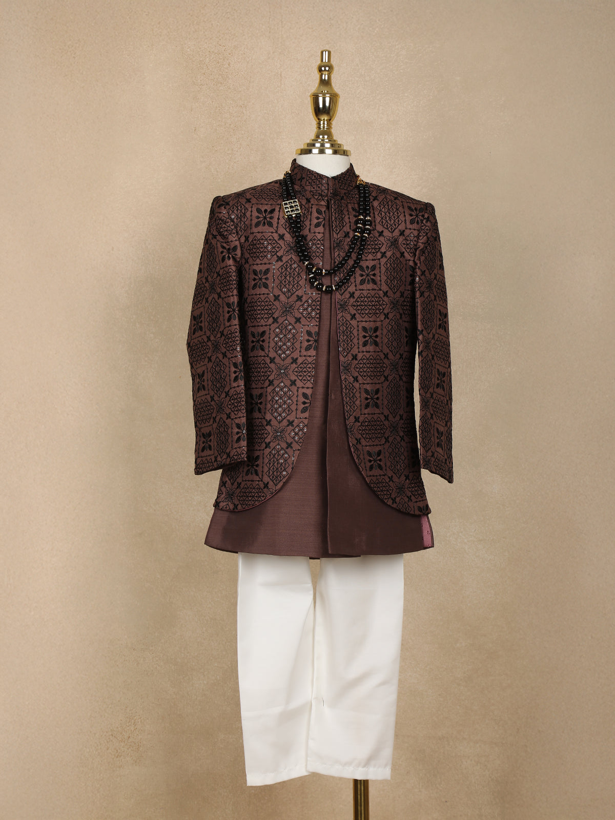 Brown Geometric Embroidered Kids Semi Silk Sherwani Set with White Pants