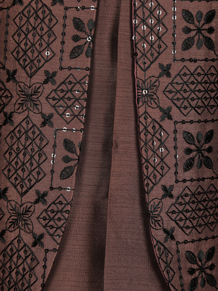 Give your little one a royal makeover with this Brown Geometric Embroidered Kids Semi Silk Sherwani Set. Designed with intricate geometric and floral embroidery highlighted with subtle sequins, this sherwani adds a touch of regal charm to every celebration. The semi silk fabric ensures comfort while maintaining a luxurious feel, paired with contrasting white pants for a crisp and elegant finish. Perfect choice for weddings, festive functions, cultural events, and photo-ready special moments.