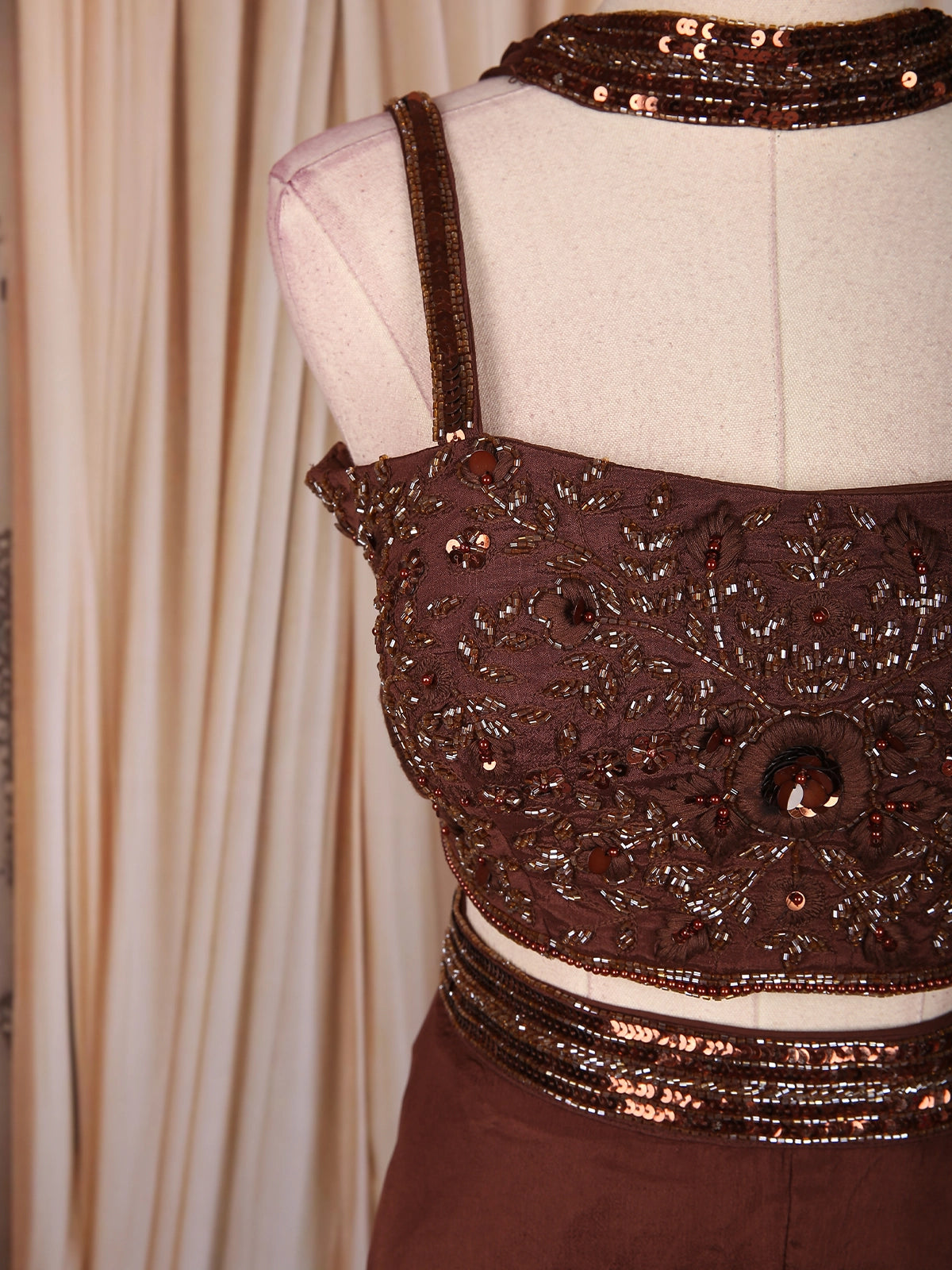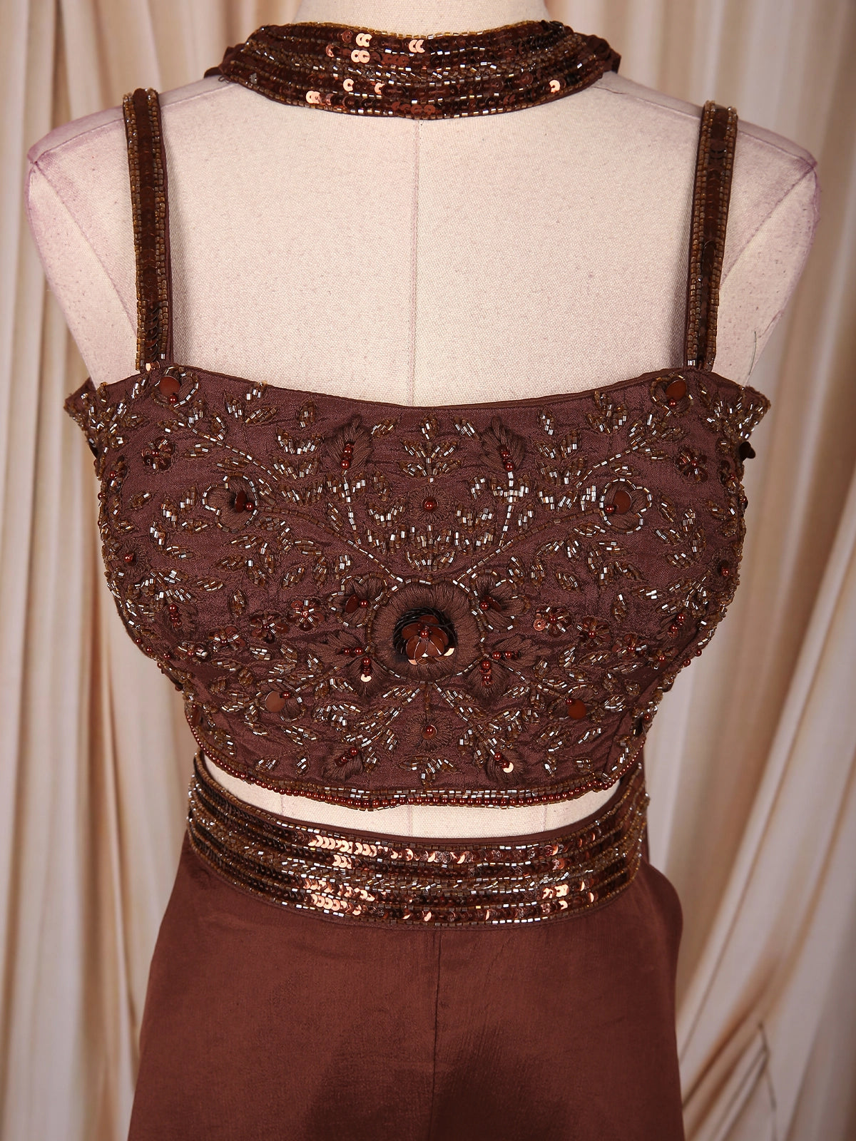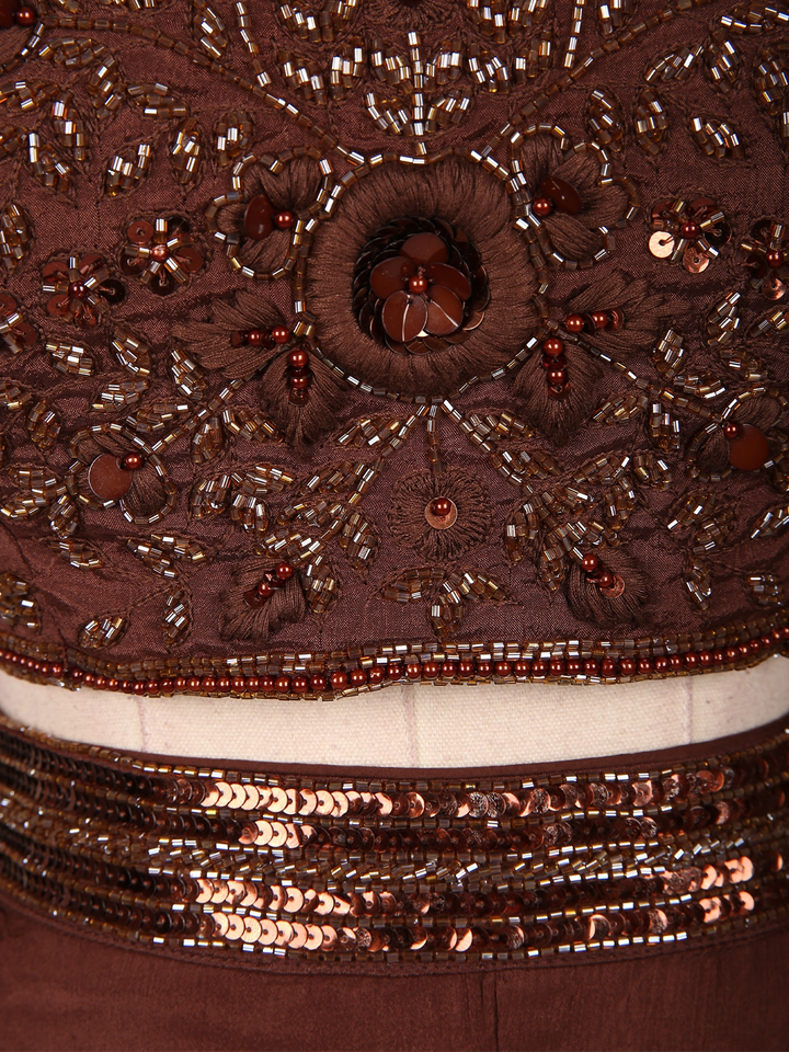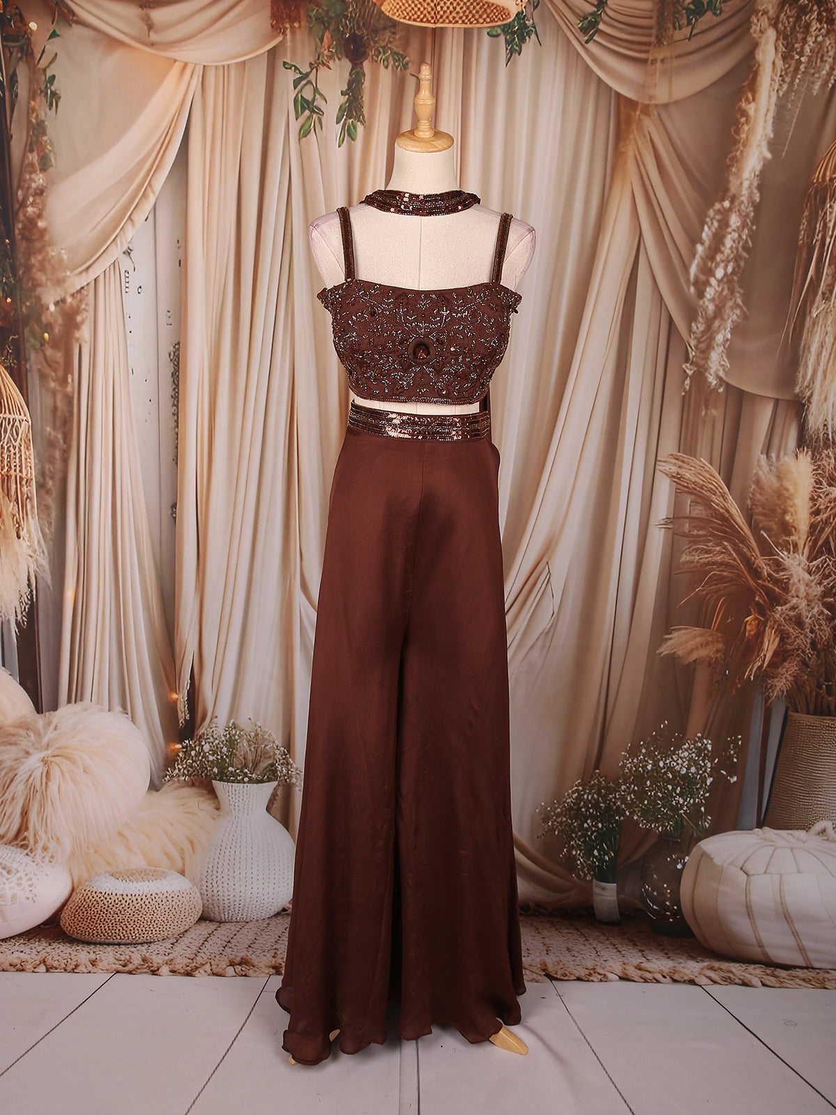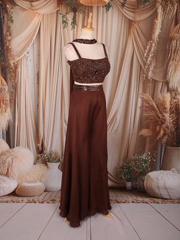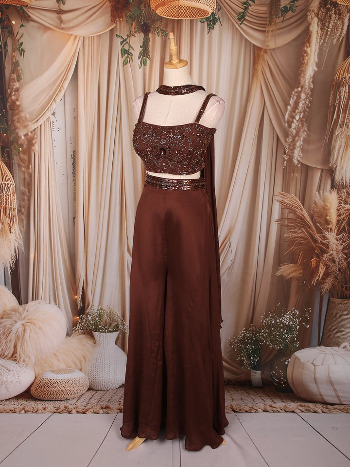 Dazzle in sophistication with this Brown Georgette Palazzo Suit, designed to make a statement at every celebration. The ensemble features a heavily sequins-embroidered crop top, intricately detailed with beads and shimmering embellishments that reflect a perfect festive radiance. The strappy blouse design with a matching embellished neckline adds a modern and glamorous touch to this elegant outfit.