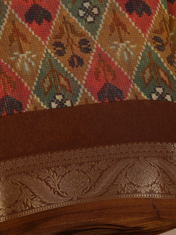 Brown Multicolor Diamond Ikat Design Linen Cotton Saree