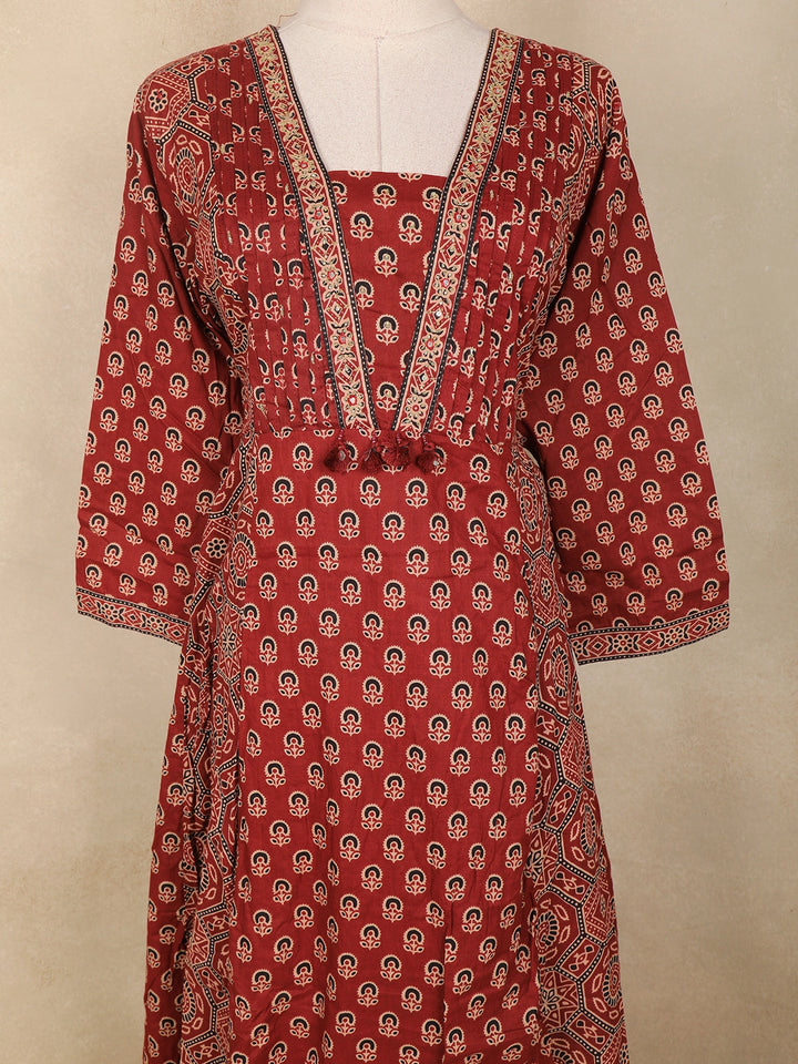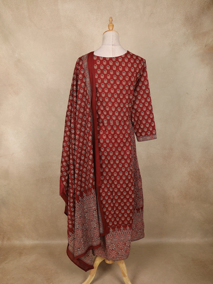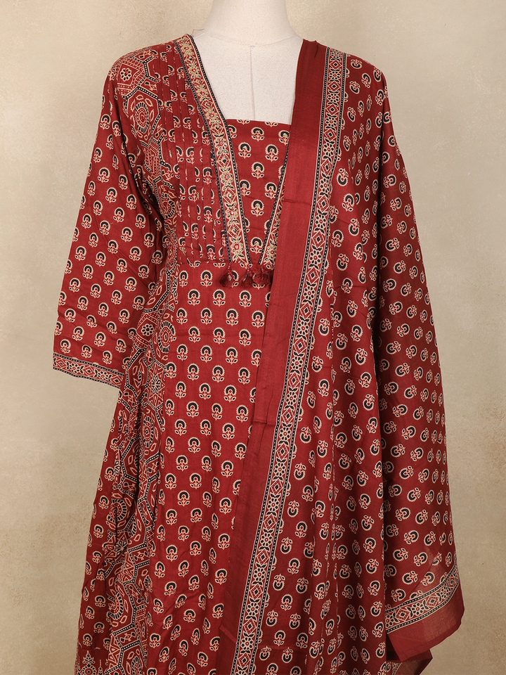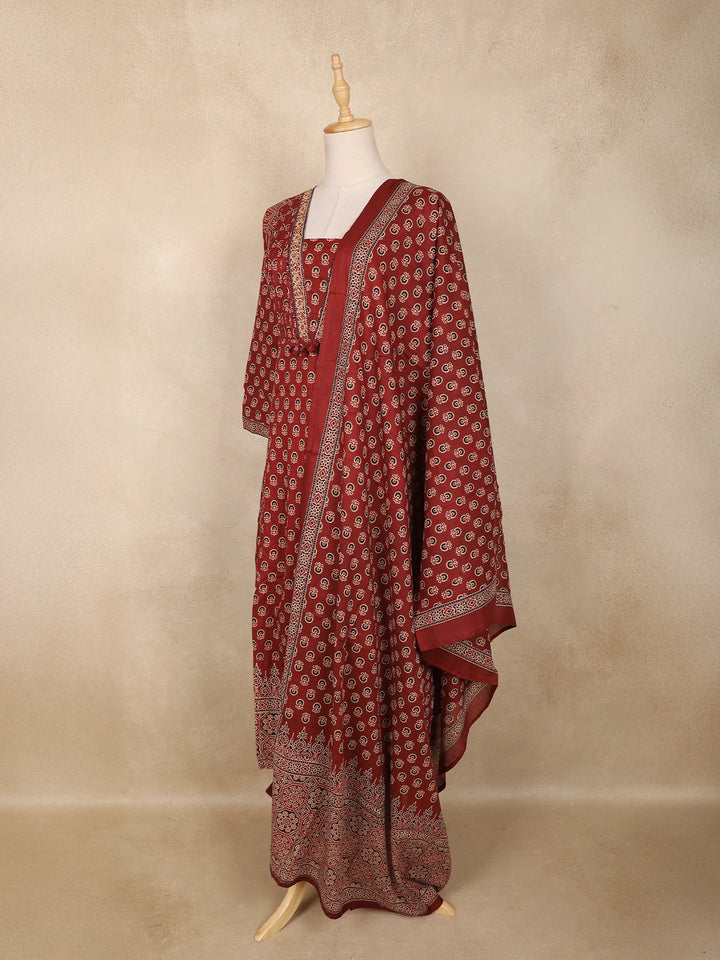 The kurta features an all-over paisley and floral buttis arranged in a uniform pattern over a warm brown base. A beautifully detailed printed yoke enhances the neckline, adding depth and richness to the ensemble. The Anarkali flare is complemented by a wide, ornate printed border that enhances movement and gives the outfit a graceful finish.