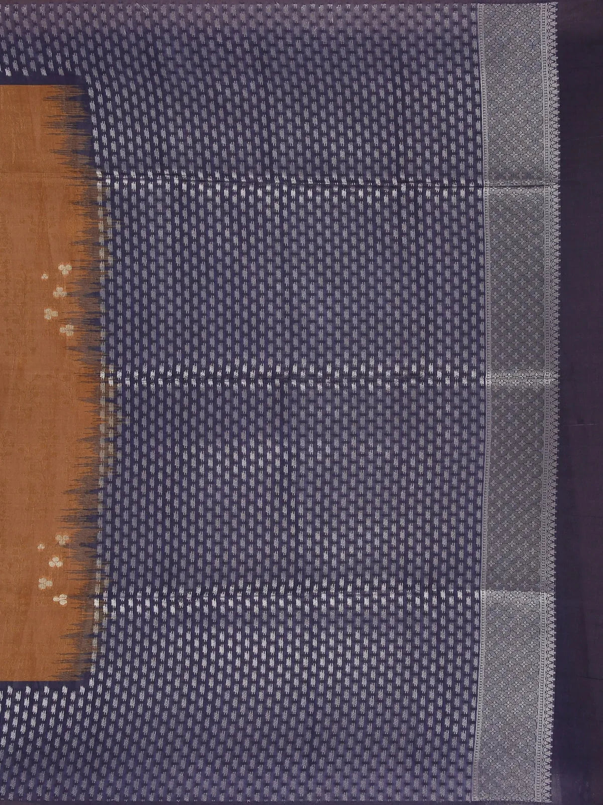 The warm brown base is perfectly balanced by a contrasting navy blue blouse and matching pallu, introducing a rich depth that enhances the saree’s visual appeal. The pallu mirrors the floral elegance of the body, creating a cohesive and polished finish.