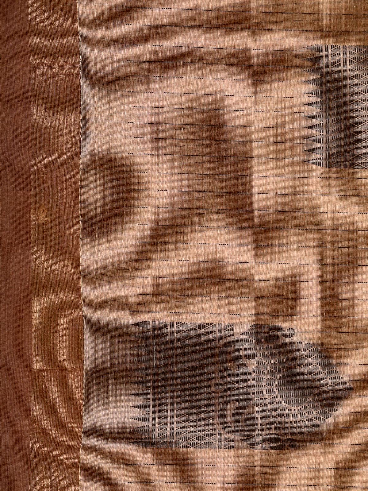 Step into timeless elegance with this Brown Handloom Cotton Saree, beautifully woven with fine horizontal stripes and traditional temple-inspired motifs placed across the body. The earthy brown tone reflects understated sophistication, making it a versatile choice for office wear, spiritual functions, and cultural gatherings.
