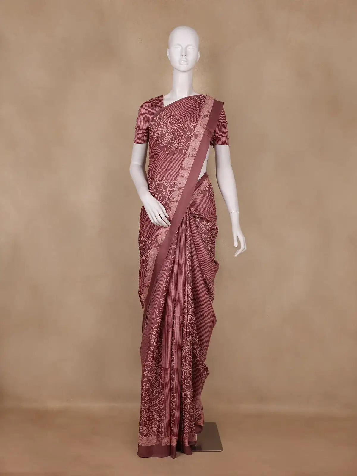 The saree is adorned with a refined striped woven design that gives it a modern edge, while the designer border enhances its overall appeal with intricate artistry. Its matching maroon blouse and coordinated pallu create a seamless look, bringing harmony and sophistication to the drape.