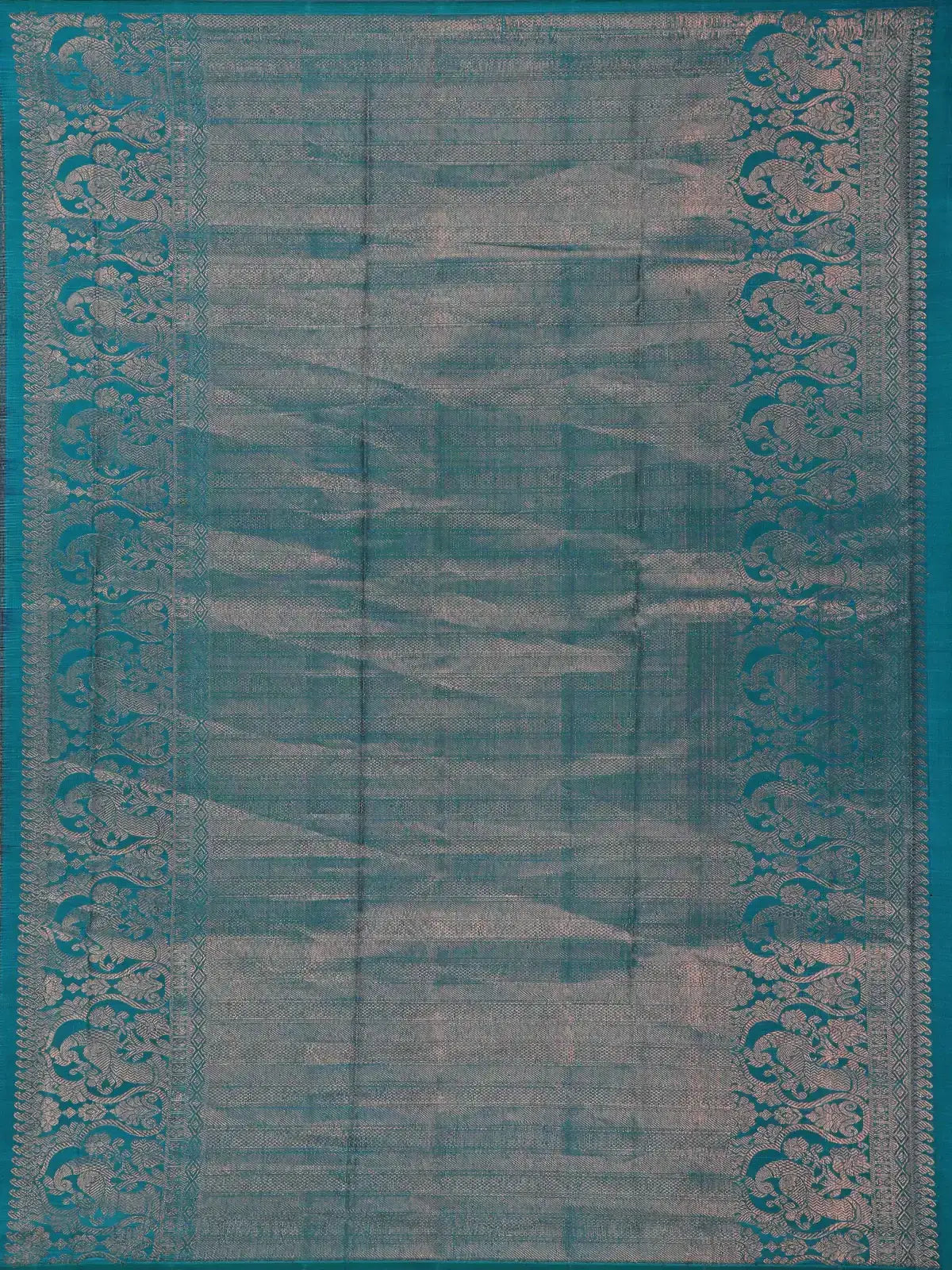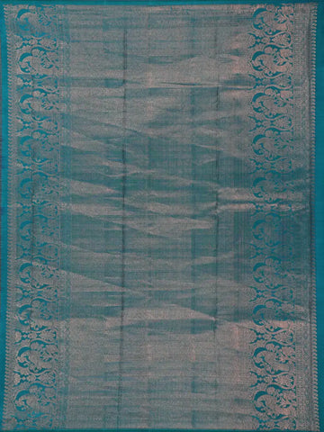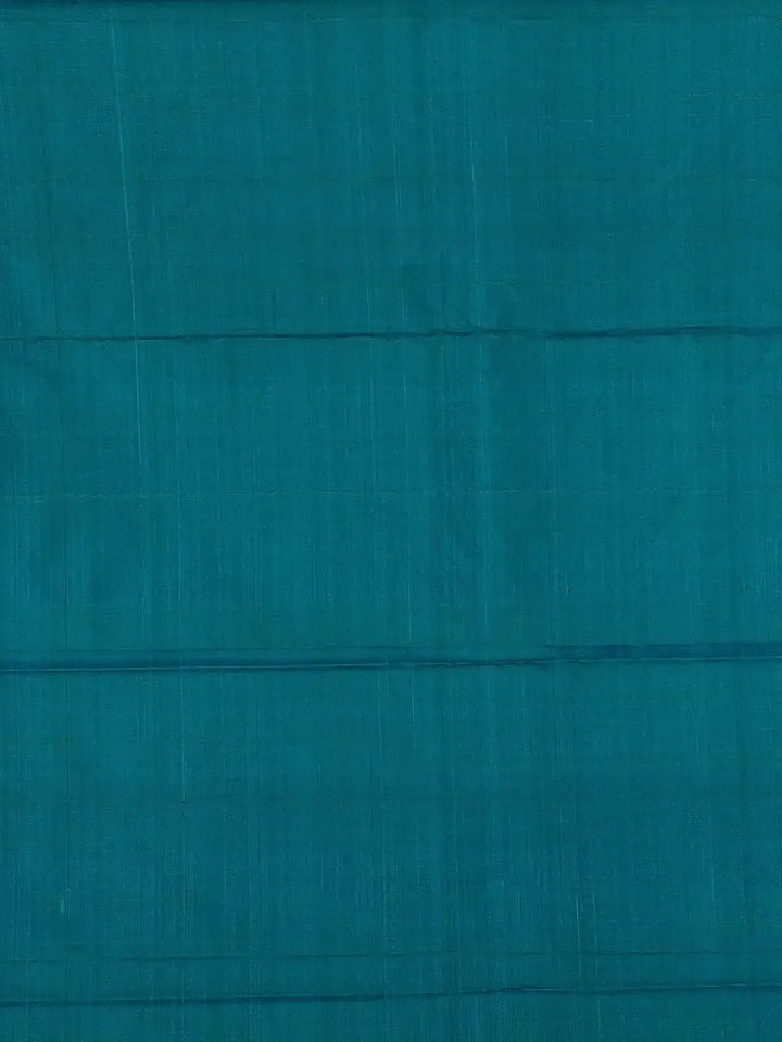 The saree is enhanced with a contrast blue pallu and blouse, creating a striking balance of colors that highlight the richness of the silk. Its solid border lends a refined finish, allowing the motifs and fabric to take the spotlight.
