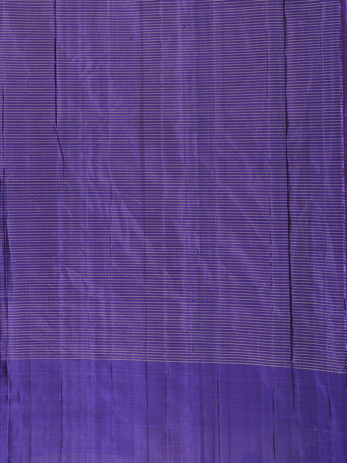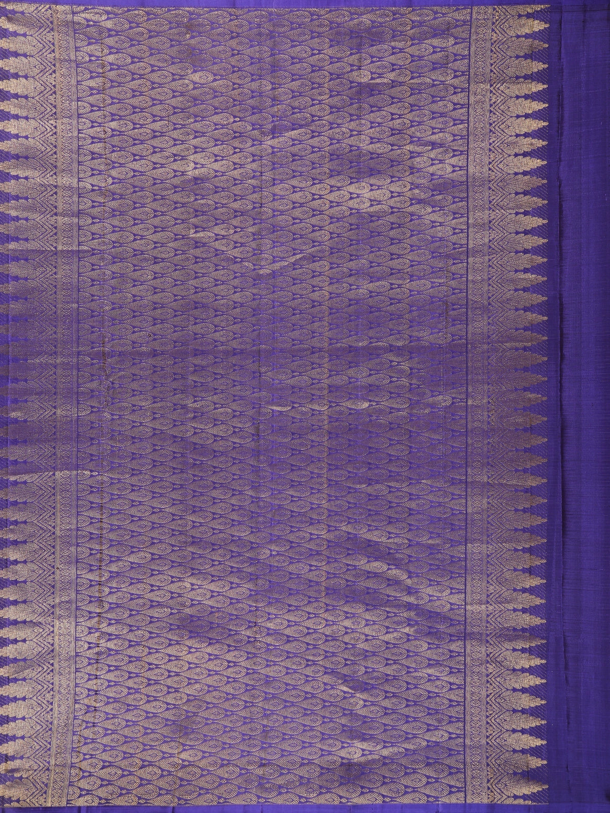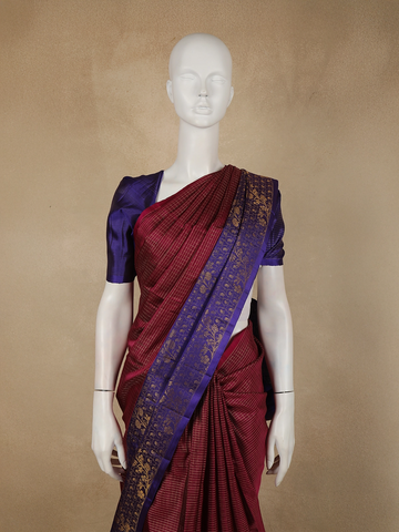 The highlight of this saree lies in its striking contrast border, rendered in a regal royal purple tone and adorned with intricate antique gold zari motifs. The richly woven border and pallu lend a majestic finish, perfectly balancing the depth of the burgundy body with a bold festive contrast.
