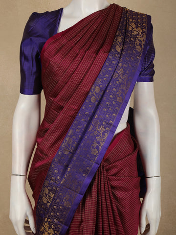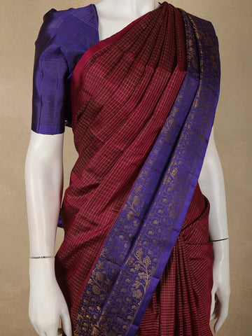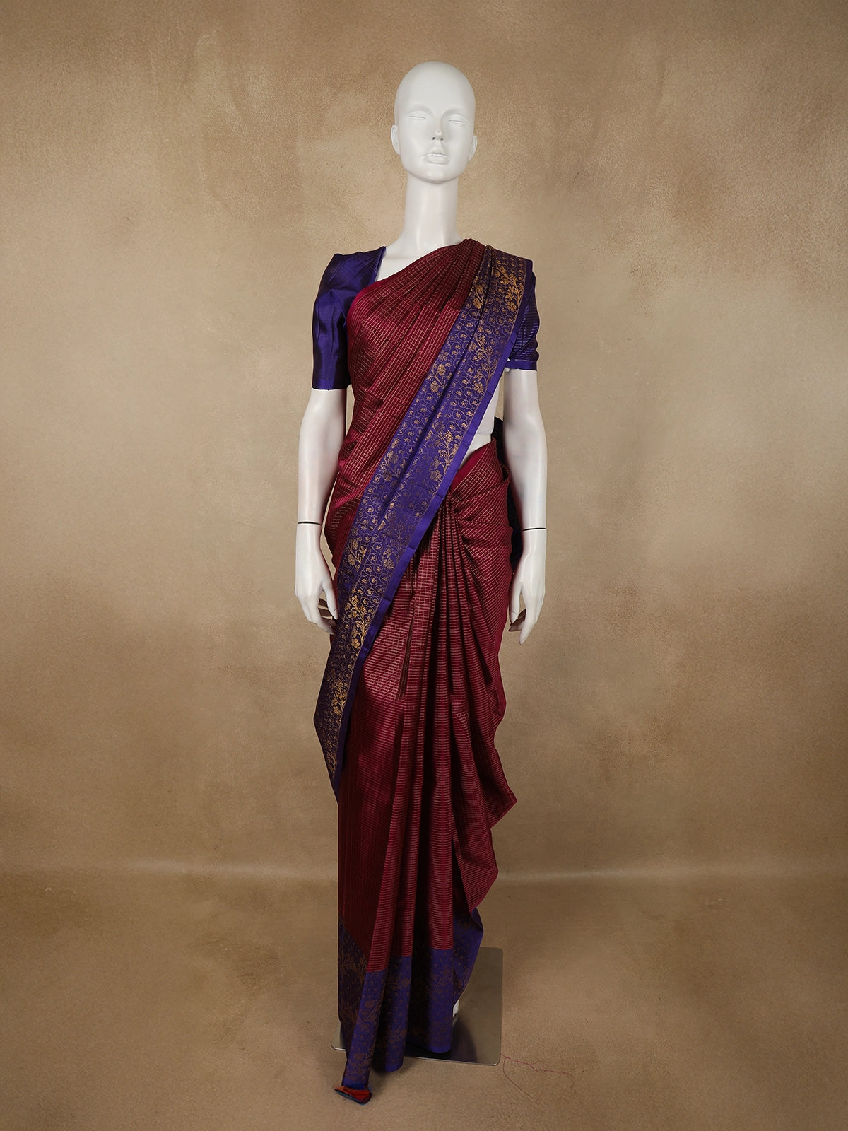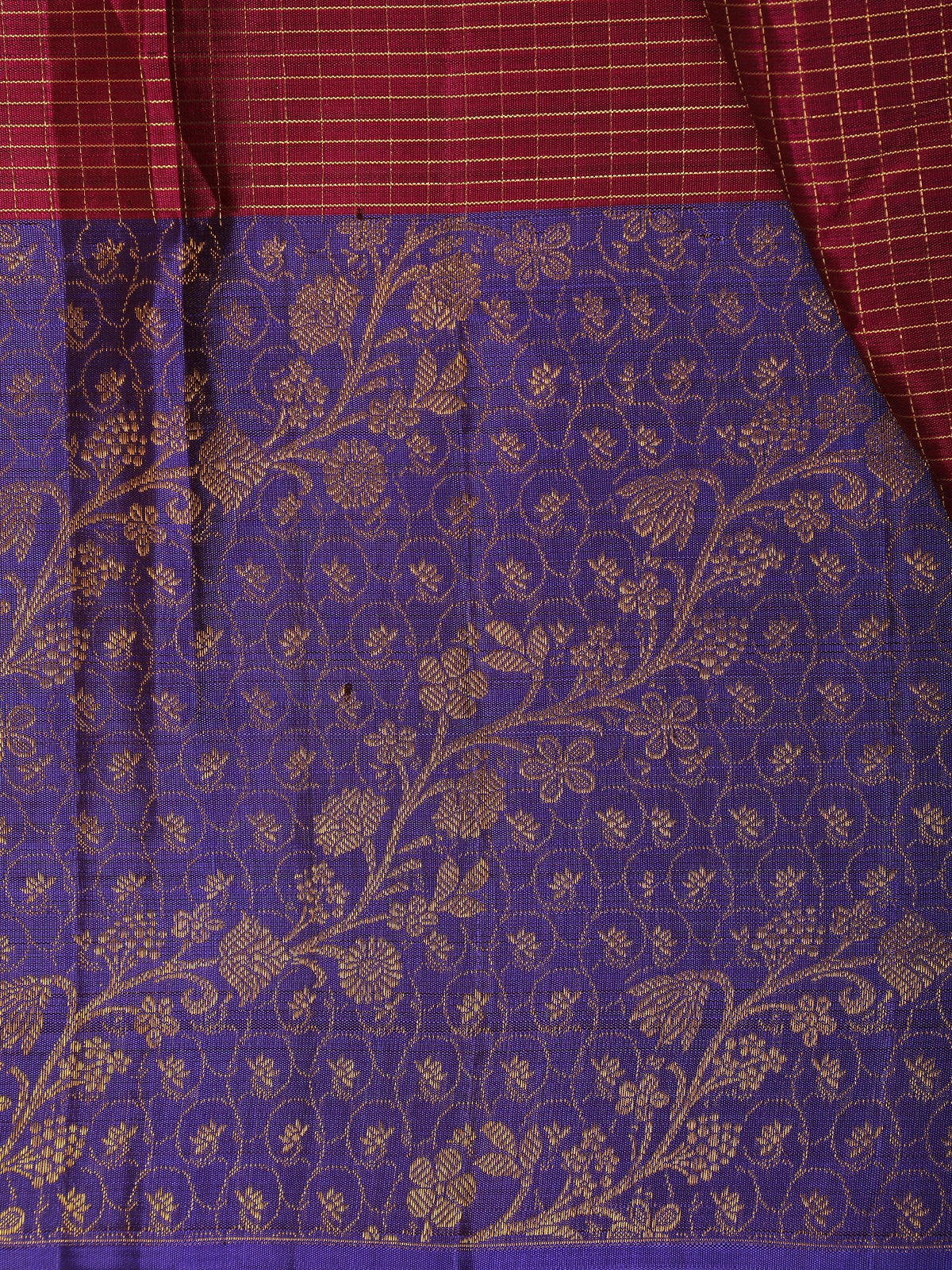 Burgundy Checked Zari Woven Design Pure Kanchipuram Silk Saree with Contrast Border