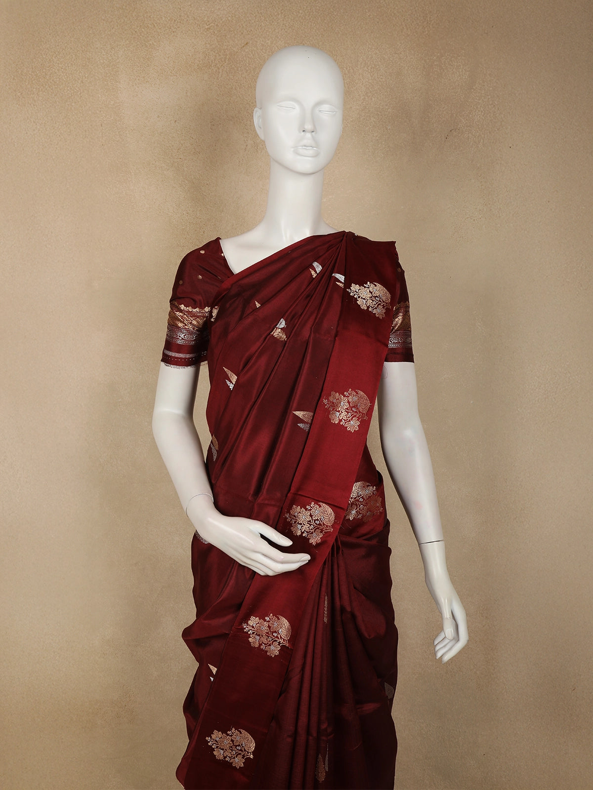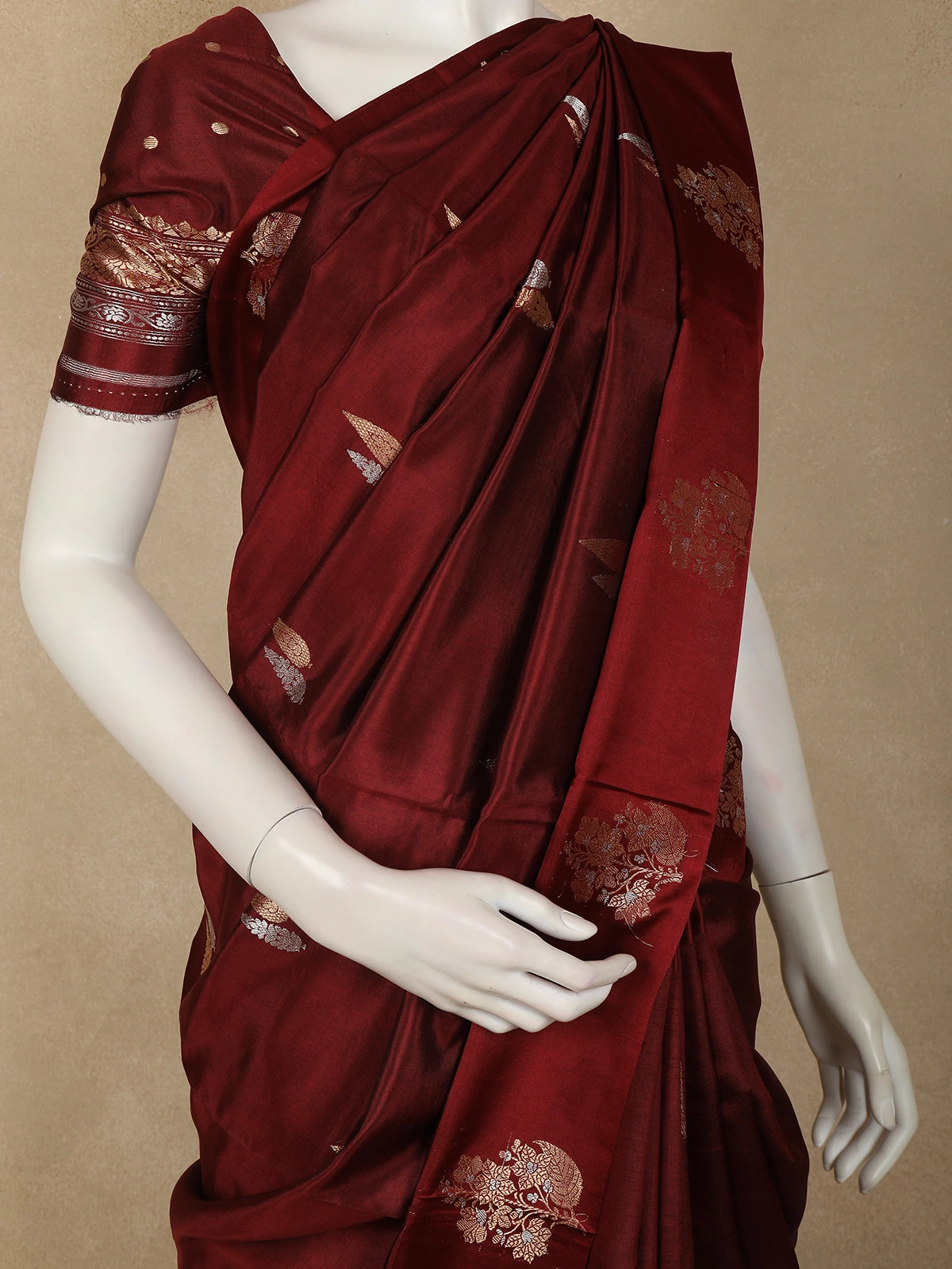 Enhancing its regal charm is a beautifully crafted designer border, highlighted with elaborate zari work that perfectly complements the richness of the burgundy base. The combination of floral motifs and ornate border detailing lends the saree a sophisticated and opulent look, making it an ideal choice for weddings, festive celebrations, and grand occasions.