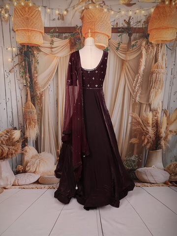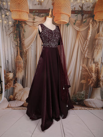 Make a graceful statement with this Burgundy Satin Bridesmaids Gown, exquisitely detailed with heavy sequins and thread embroidered work on the bodice. The rich burgundy shade adds depth, elegance, and sophistication, making it a perfect choice for evening events, receptions, sangeet functions, and bridesmaid ensembles.