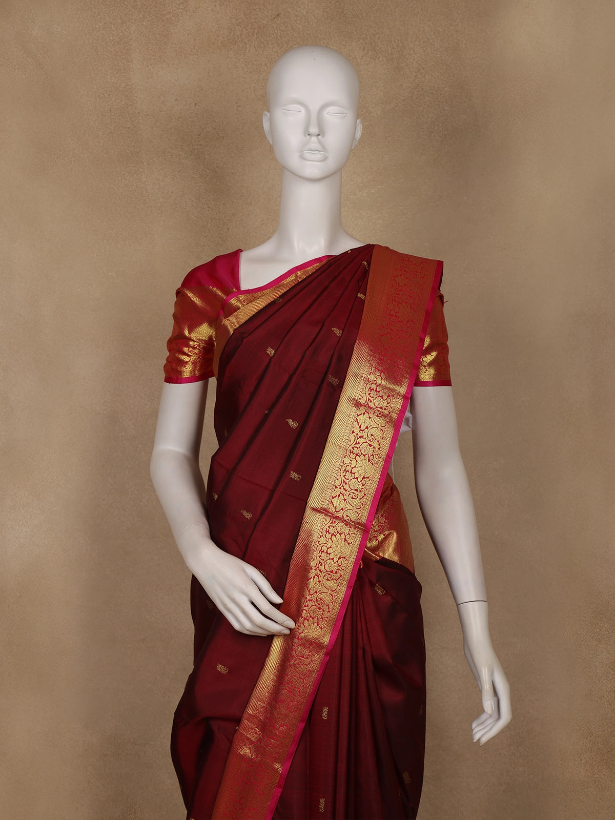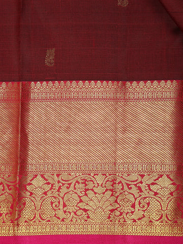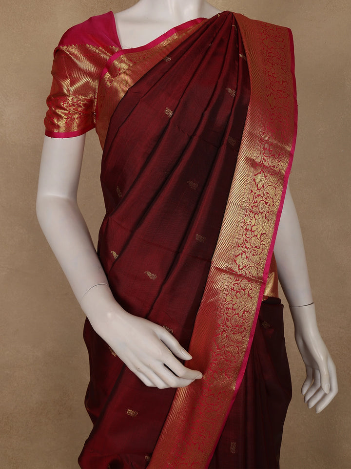 Embrace timeless elegance with this Burgundy Pure Kanchipuram Silk Saree, adorned with delicate small butta motifs intricately woven across the body. The contrasting pink pallu and blouse add a vibrant touch, beautifully complementing the regal burgundy base. The saree is framed with a traditional zari border, enhancing its luxurious appeal and festive charm.