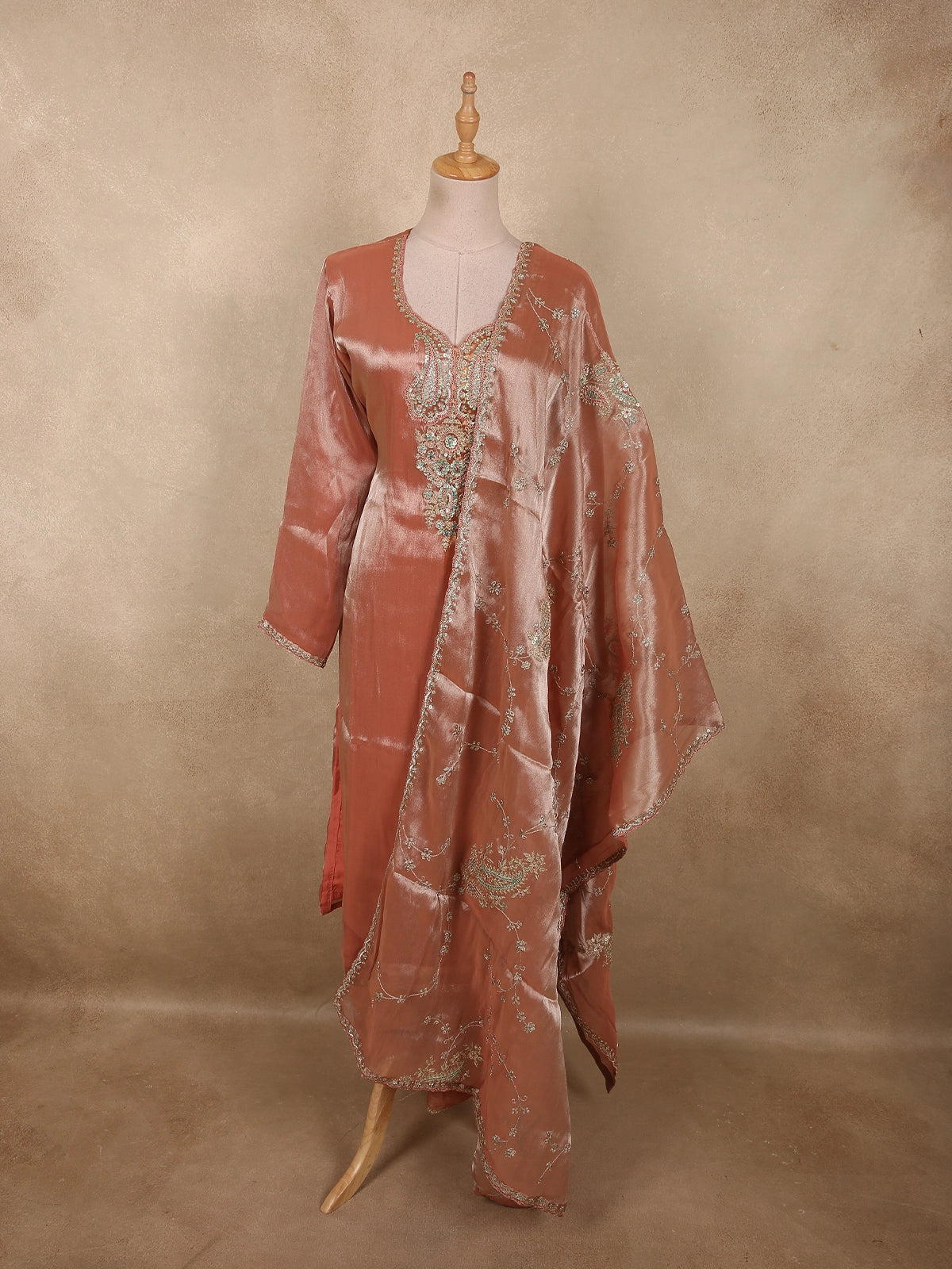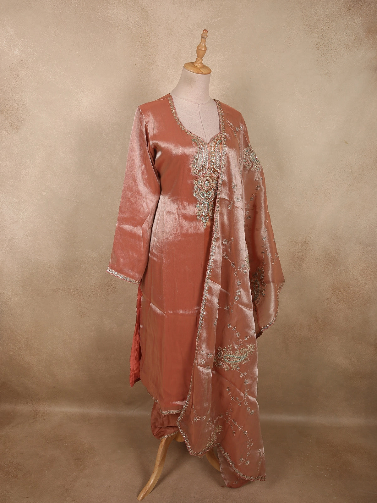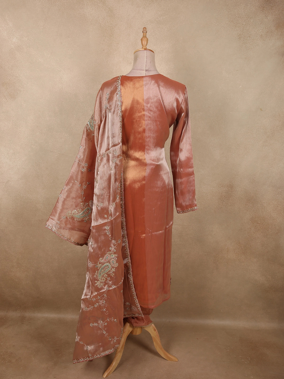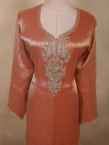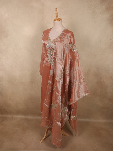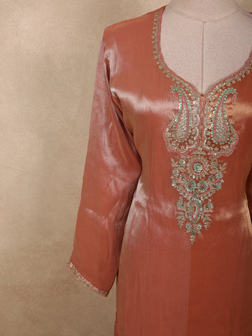 Burnished Copper Peach Sequins Embroidered Design Tissue Silk Salwar Straight Cut salwar Suit with Dupatta