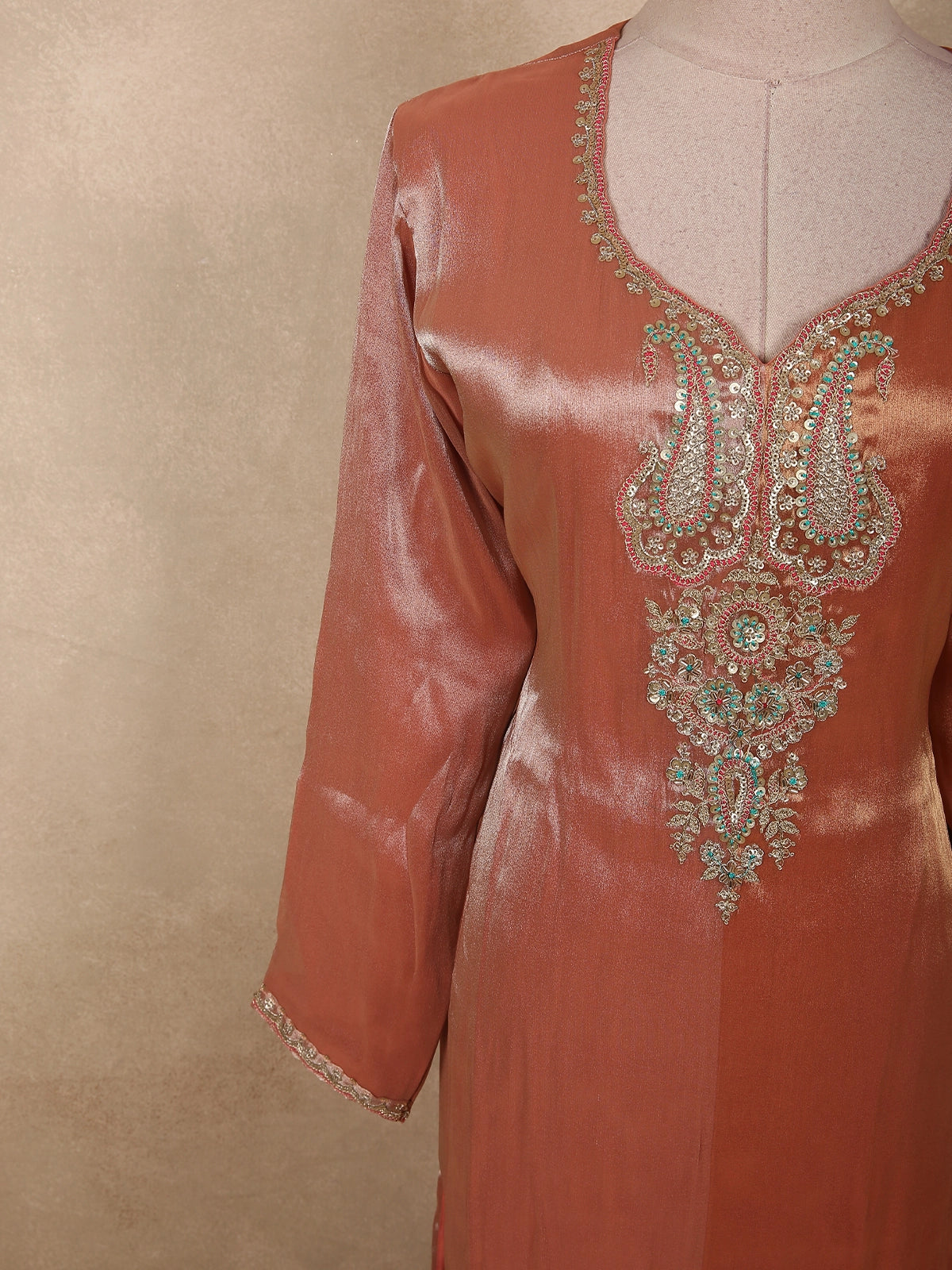 The straight-cut kurta is tailored in premium tissue silk, offering a sleek and elegant silhouette. The V-shaped neckline is adorned with intricate sequins, zari, and thread embroidery, arranged in ornate paisley and floral motifs that create a refined focal point. Subtle shimmer detailing enhances the richness of the base color while maintaining an understated sophistication.