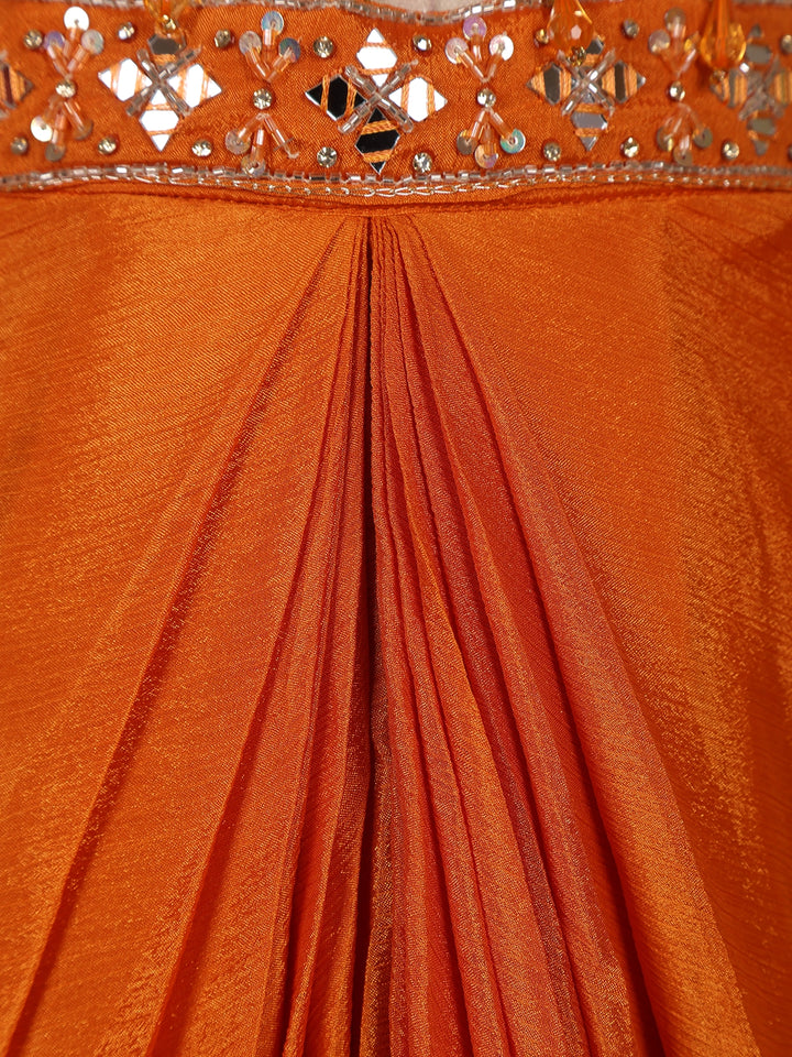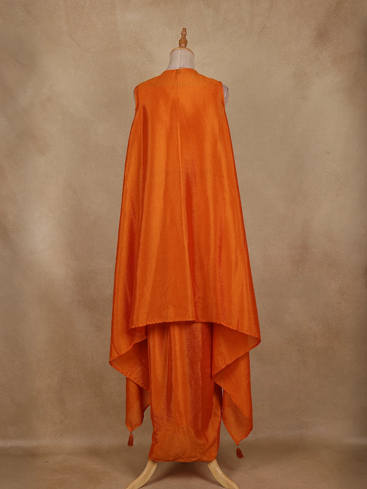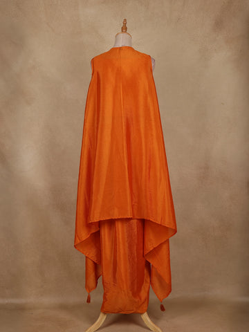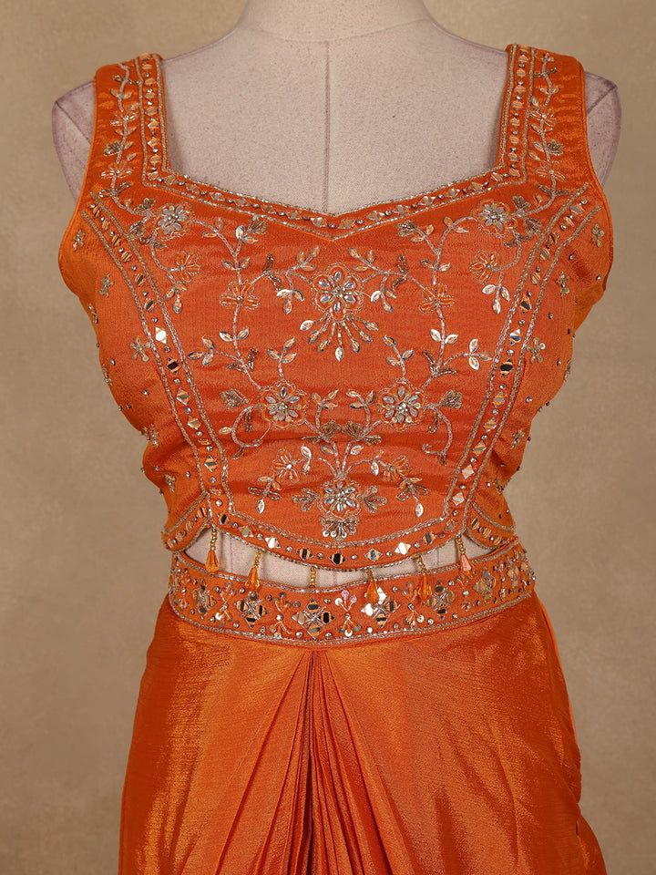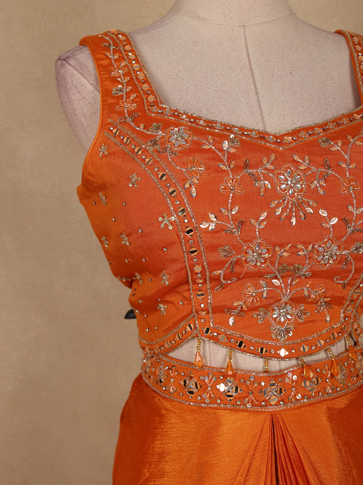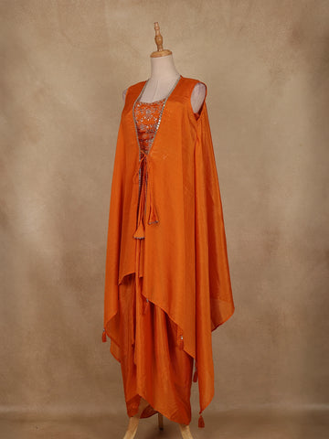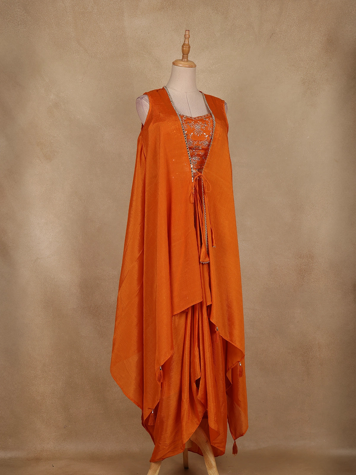 Turn heads this festive season in this radiant burnt orange floral embroidered crepe silk skirt top set. The square-neck sleeveless blouse is beautifully embellished with mirror and floral thread embroidery, adding a sparkling touch to its elegant design. The flowing crepe silk skirt drapes gracefully, creating a flattering and fluid silhouette. A matching asymmetrical cape with tassel detailing completes the ensemble, giving it a modern yet regal finish. Perfect for festive occasions, weddings, and special celebrations, this outfit embodies effortless grace and contemporary sophistication.