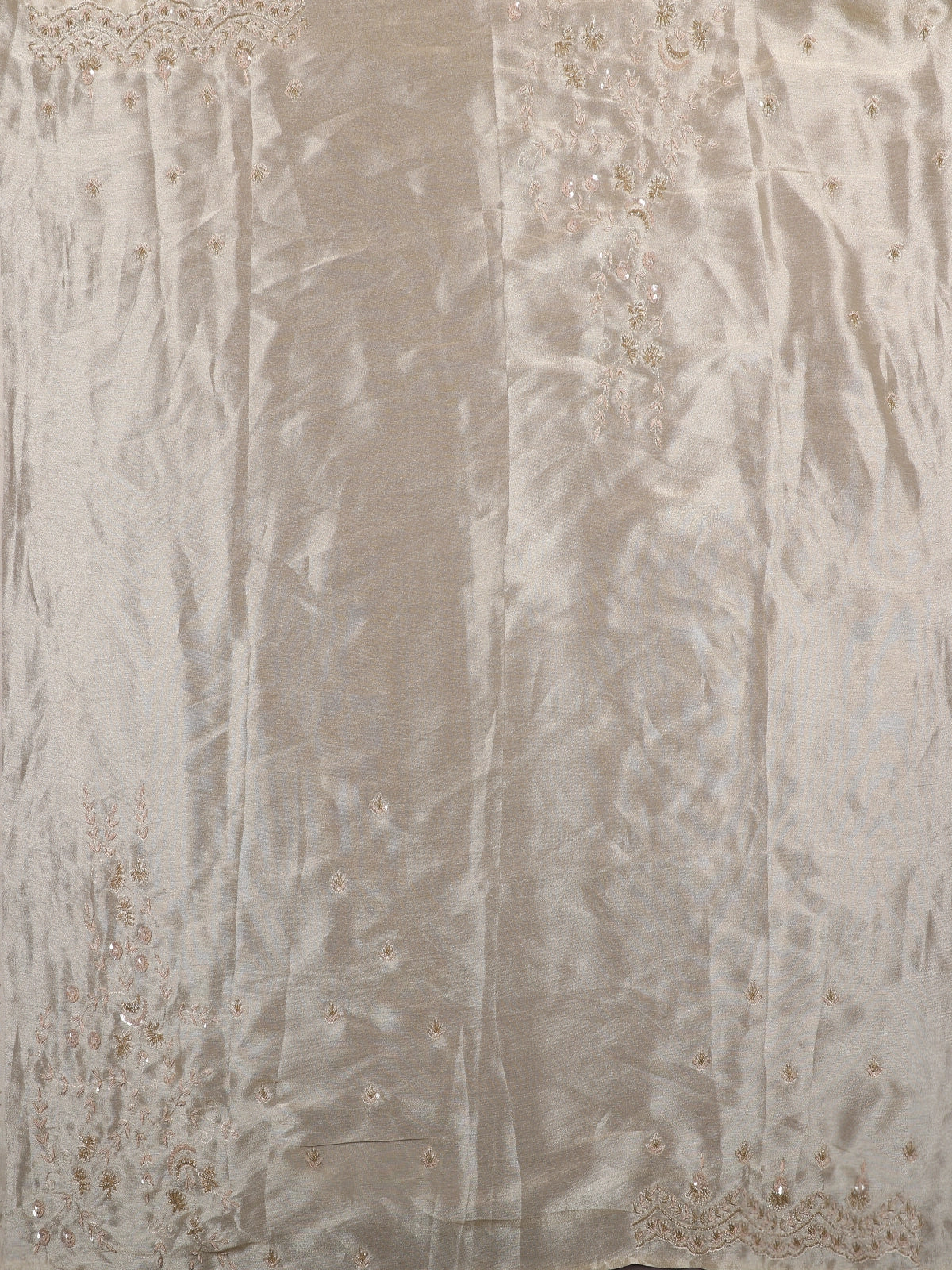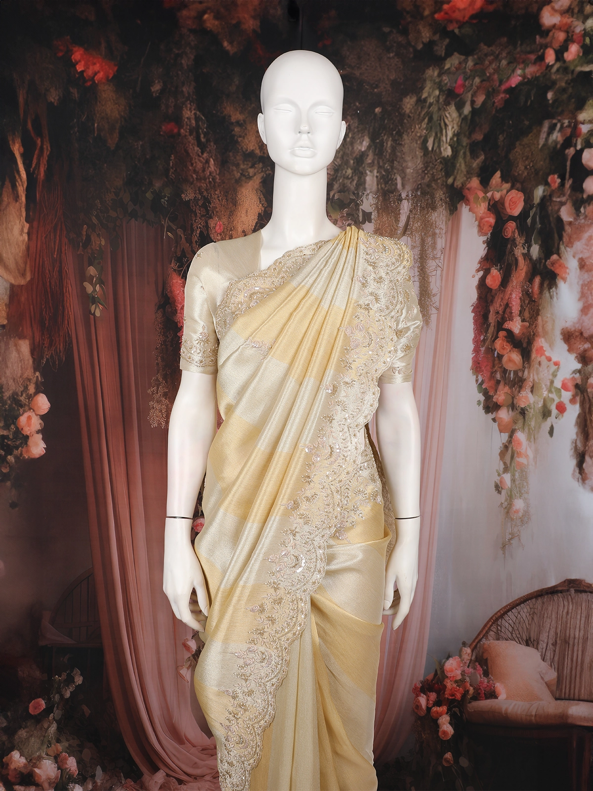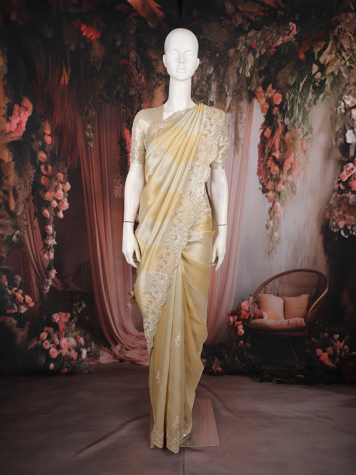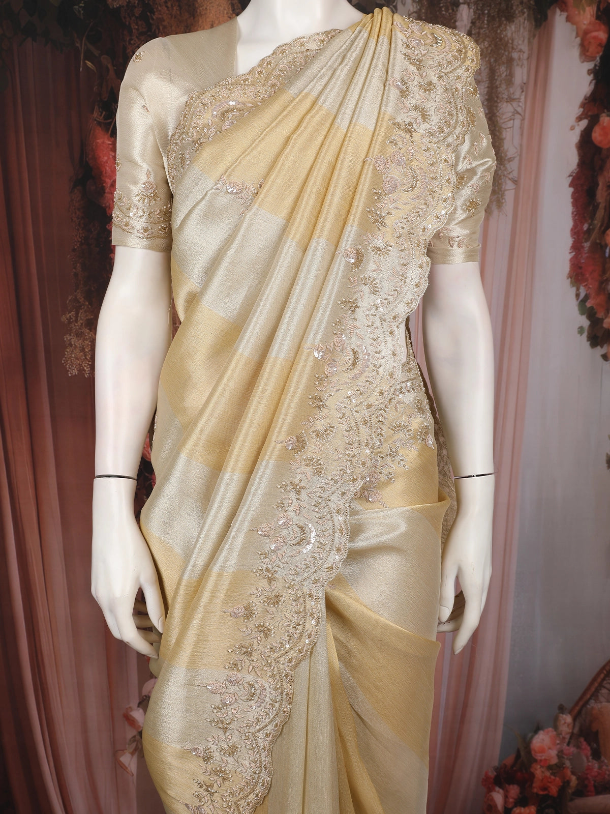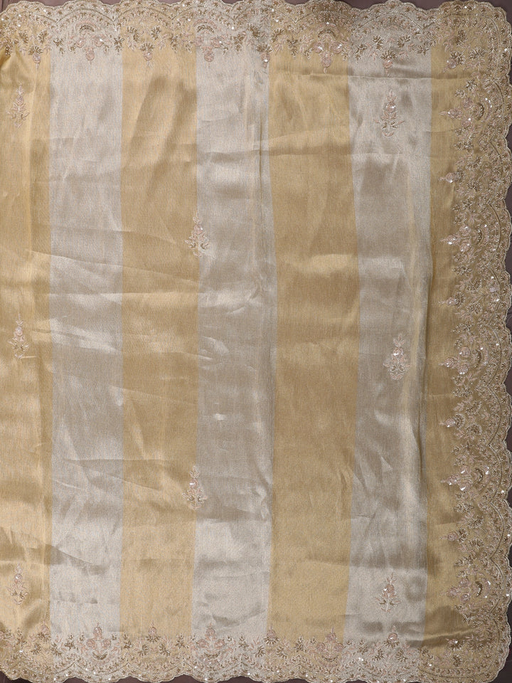 Champagne Beige Floral Design Tissue Silk Saree