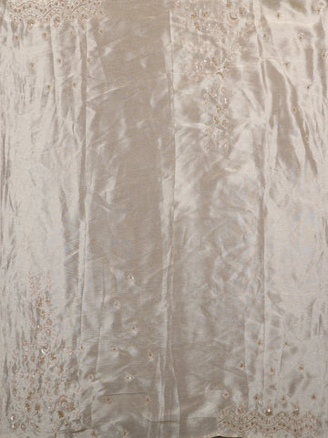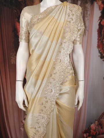Wrap yourself in subtle luxury with this Champagne Beige Tissue Silk Saree, beautifully woven with a natural shimmering finish that reflects light with every movement. The saree features a delicate floral embroidered designer border, enriched with fine thread detailing and soft sequins that add a refined sparkle without overpowering the elegance of the drape.