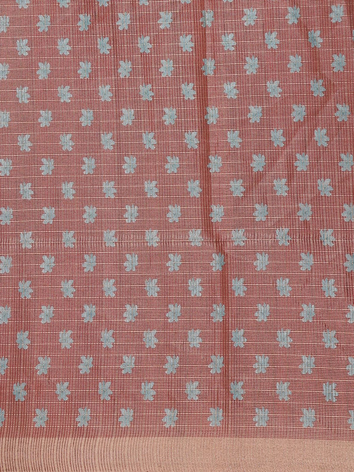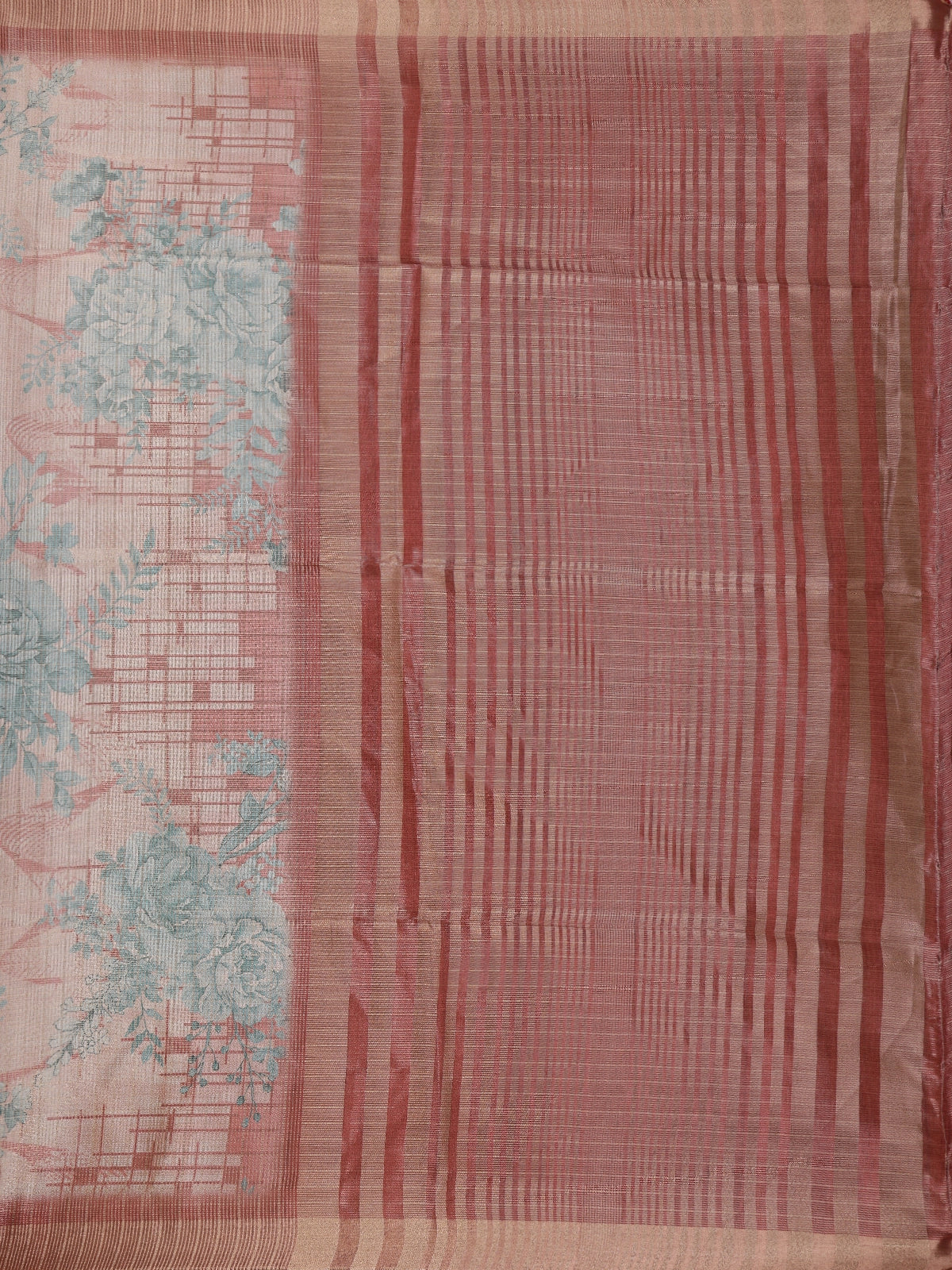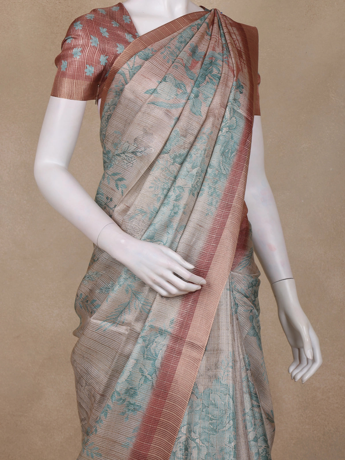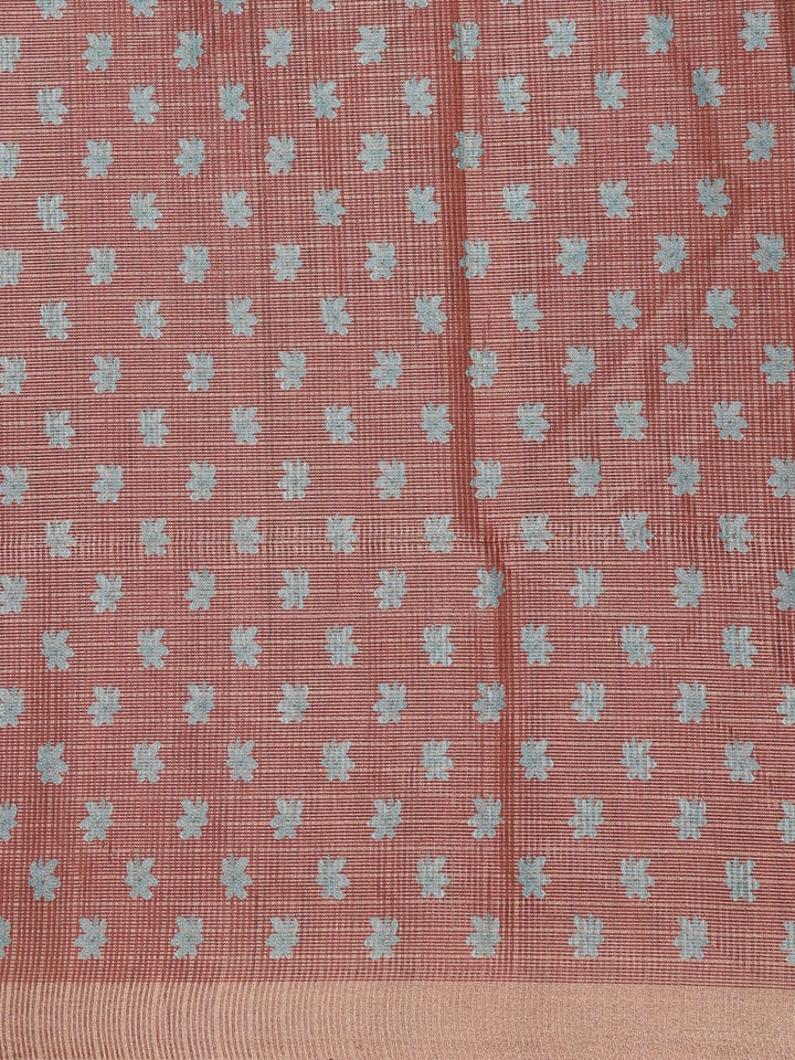 The saree features delicate teal floral prints spread gracefully across the drape, adding a serene touch of artistry to its shimmering base. It is beautifully accentuated with a contrasting copper zari border, infusing a regal warmth that enhances its festive appeal. The lightweight texture and smooth flow of tissue silk make it exceptionally comfortable while retaining its graceful fall.