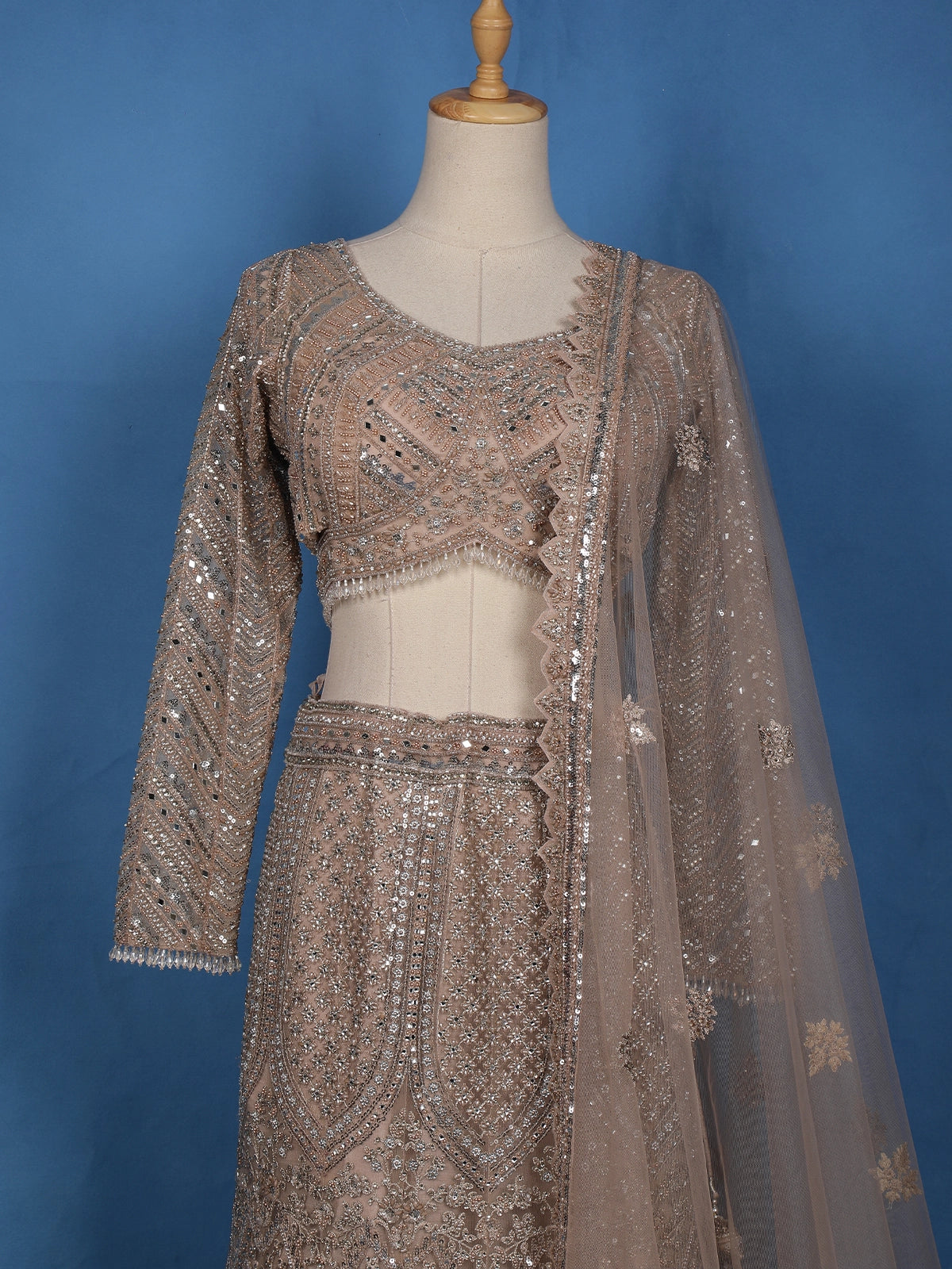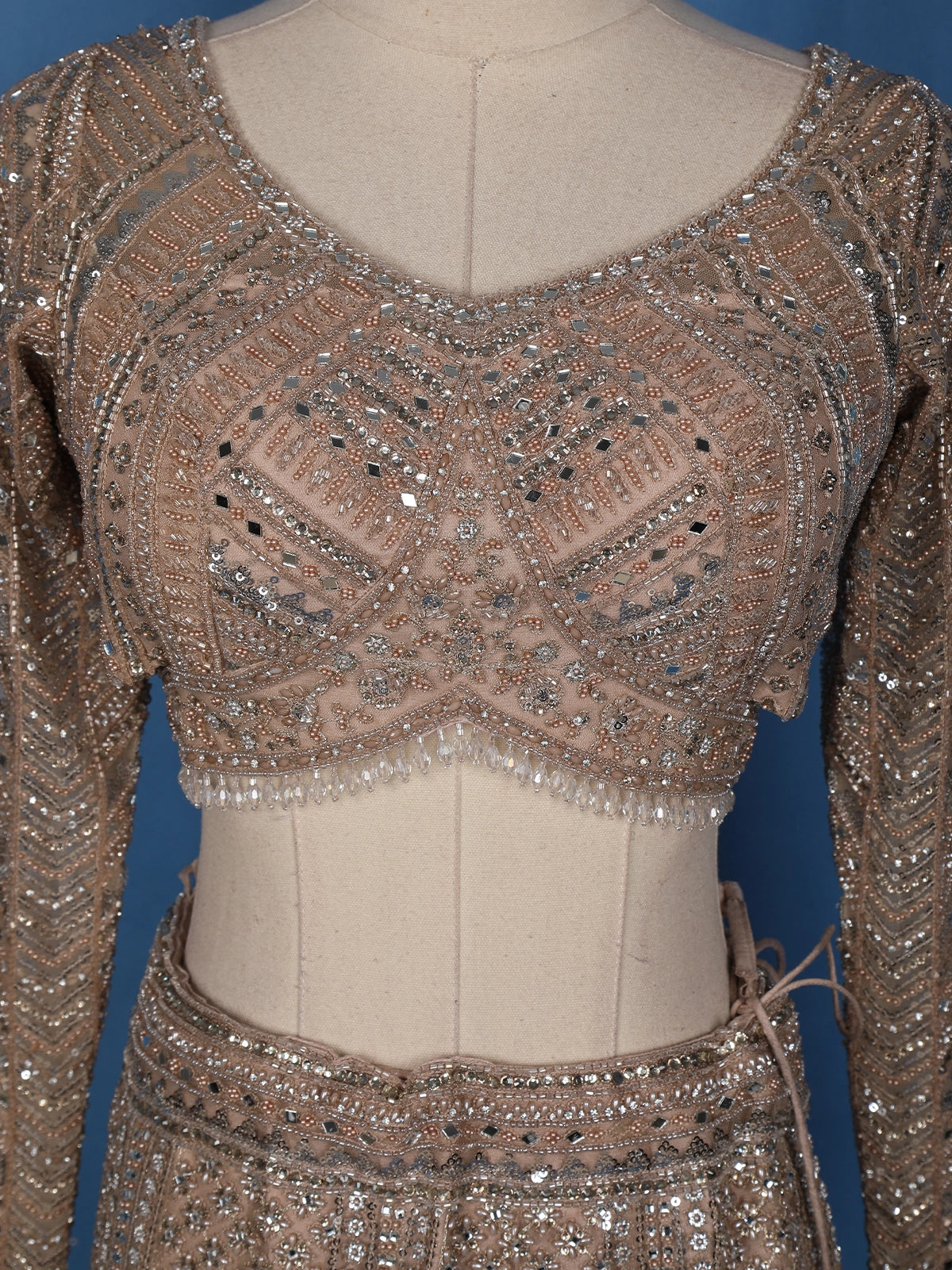 Step into glamour with this Champagne Beige Sequins Embroidered Mermaid Lehenga, a showstopper crafted for modern brides and reception soirées. The net base shimmers with intricate geometric and floral embroidery patterns, fully adorned with sequins, mirrors, and delicate beadwork.