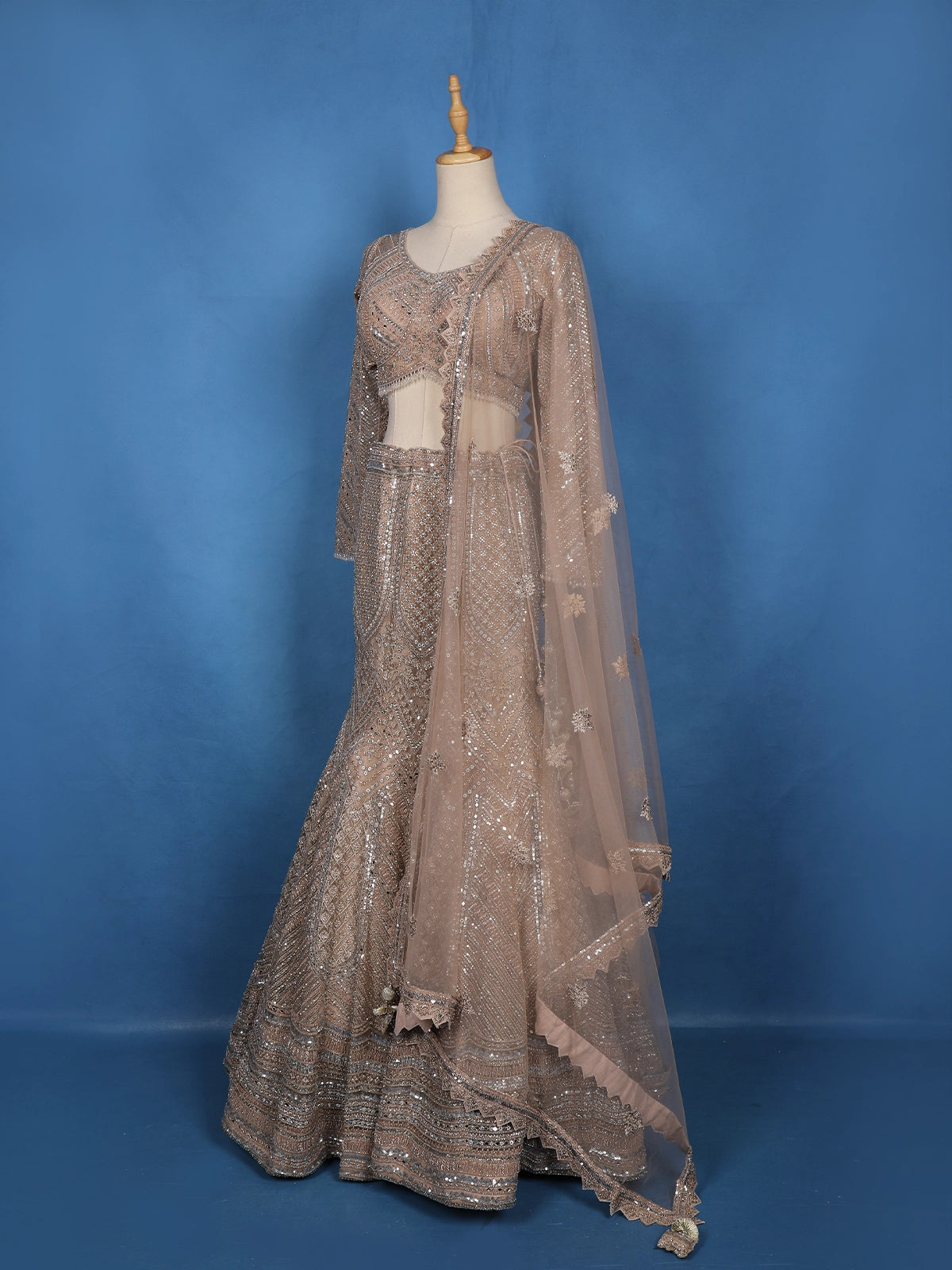 Champagne Beige Sequins Embroidered Mermaid Net Lehenga With Dupatta