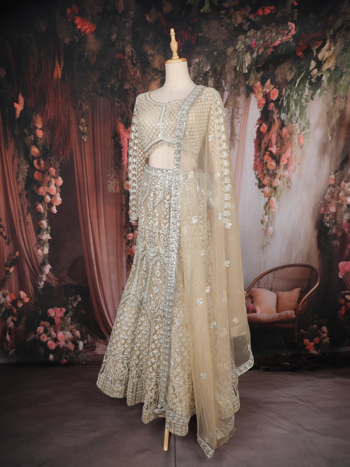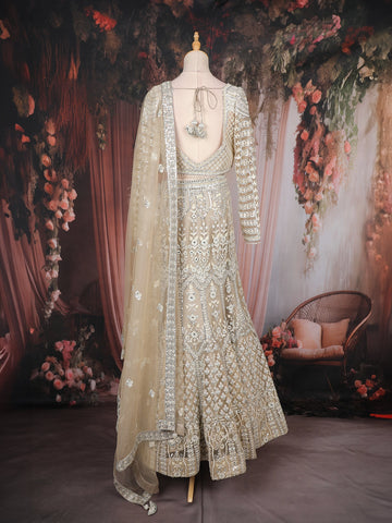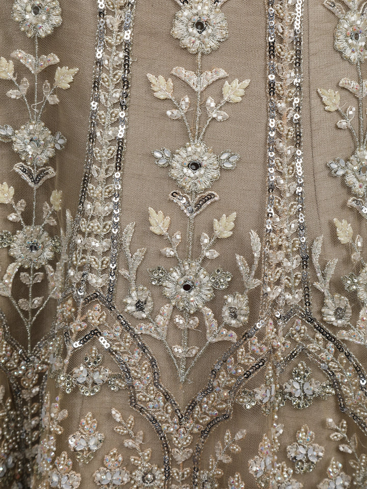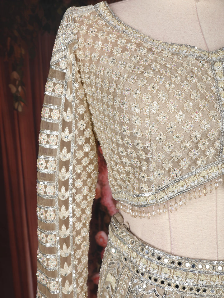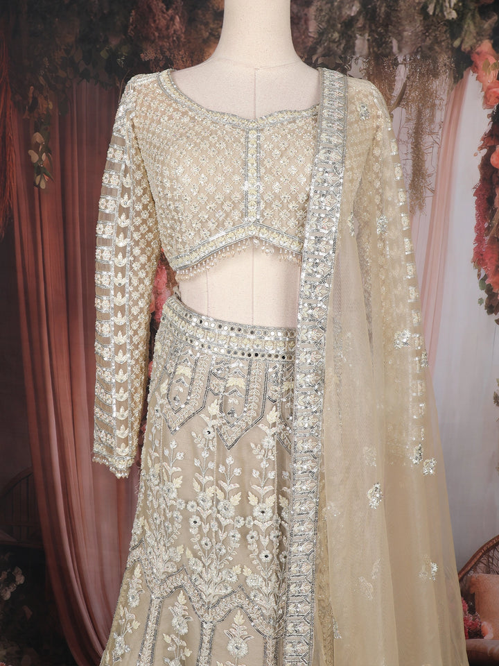 Emanate royal sophistication with this stunning Champagne Beige Sequins Embroidered Net Lehenga, a masterpiece that combines elegance and opulence with an effortless modern touch. Crafted from premium quality net fabric, this ensemble showcases intricate hand embroidery featuring sequins, zari, beads, and thread work arranged in ornate floral and geometric motifs that shimmer gracefully under light.