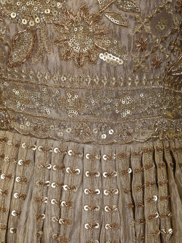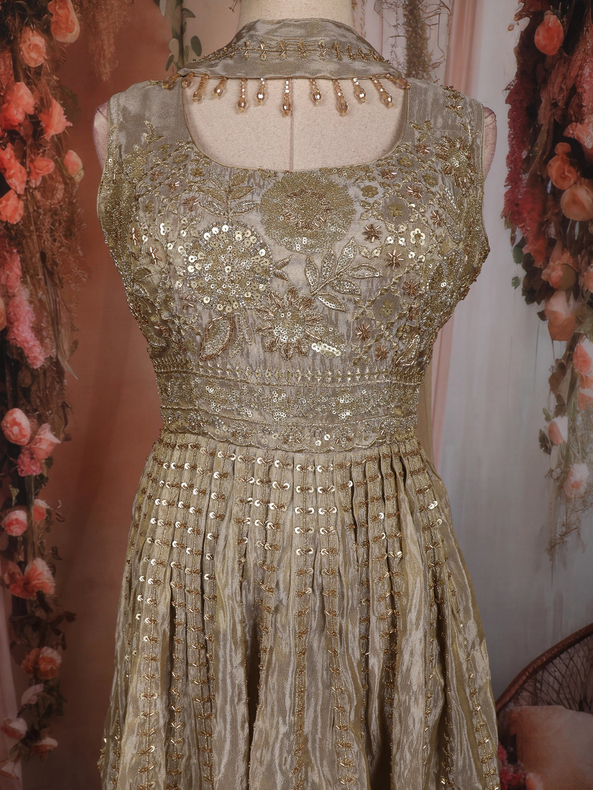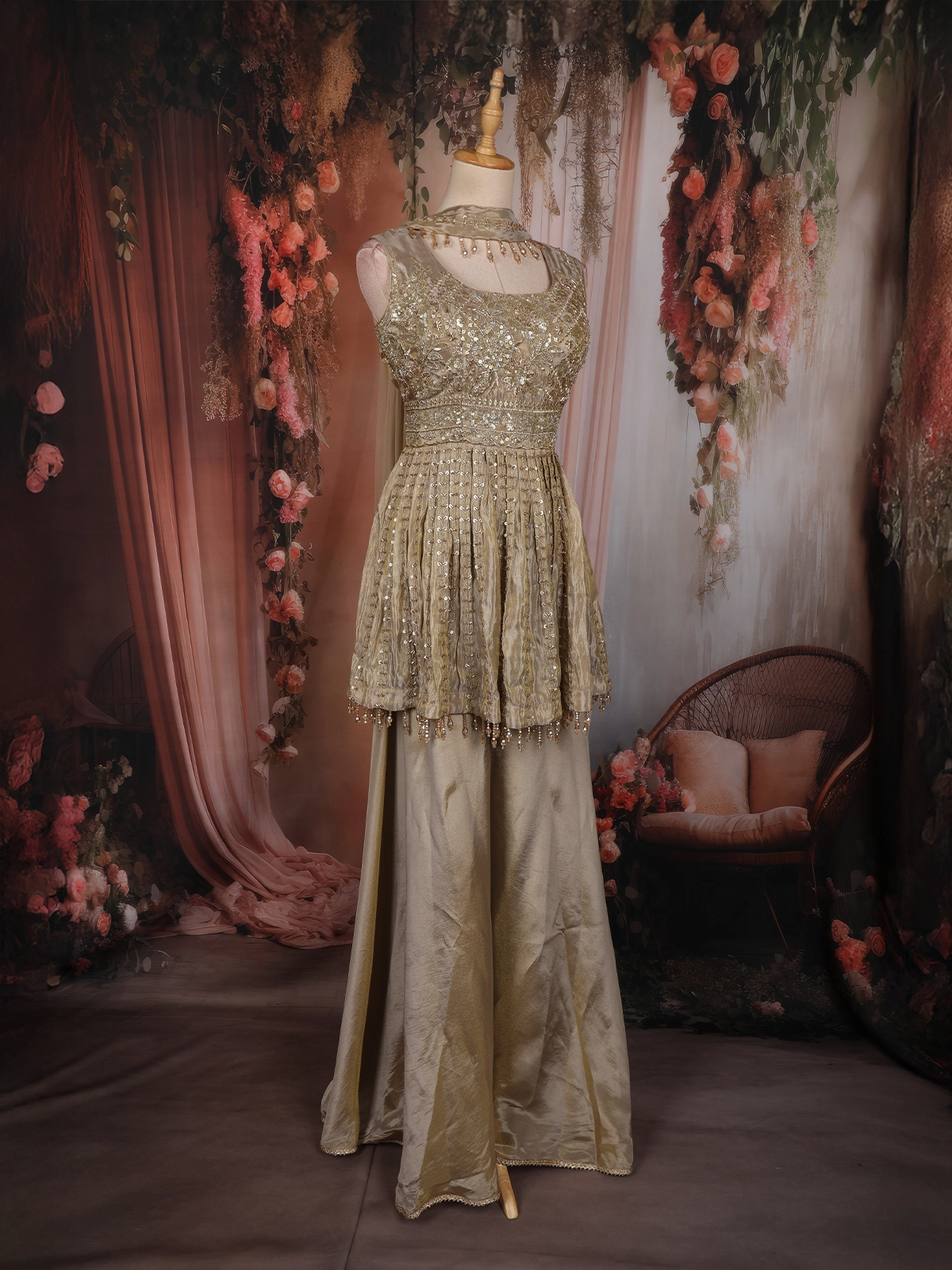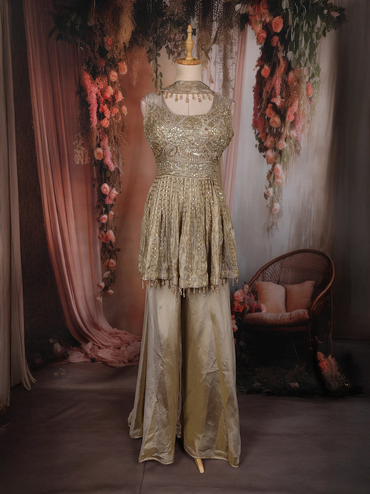 Champagne Gold Floral Sequins Embroidered Design Tissue Peplum Palazzo Suit with Dupatta