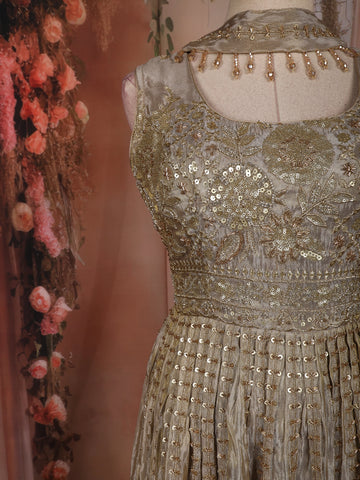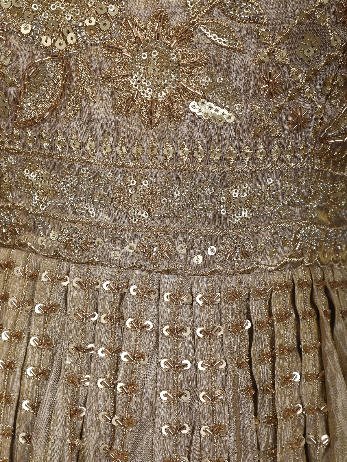 Paired with fluid palazzo pants in a matching champagne gold tone, this ensemble offers both comfort and sophistication, allowing effortless movement while maintaining a regal appearance. The look is completed with a sheer dupatta that enhances the outfit with a soft, ethereal finish, making it perfect for weddings, receptions, festive celebrations, and grand evening occasions.