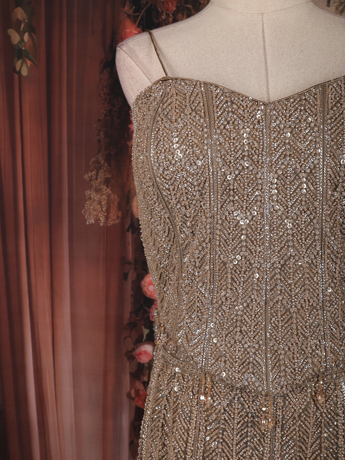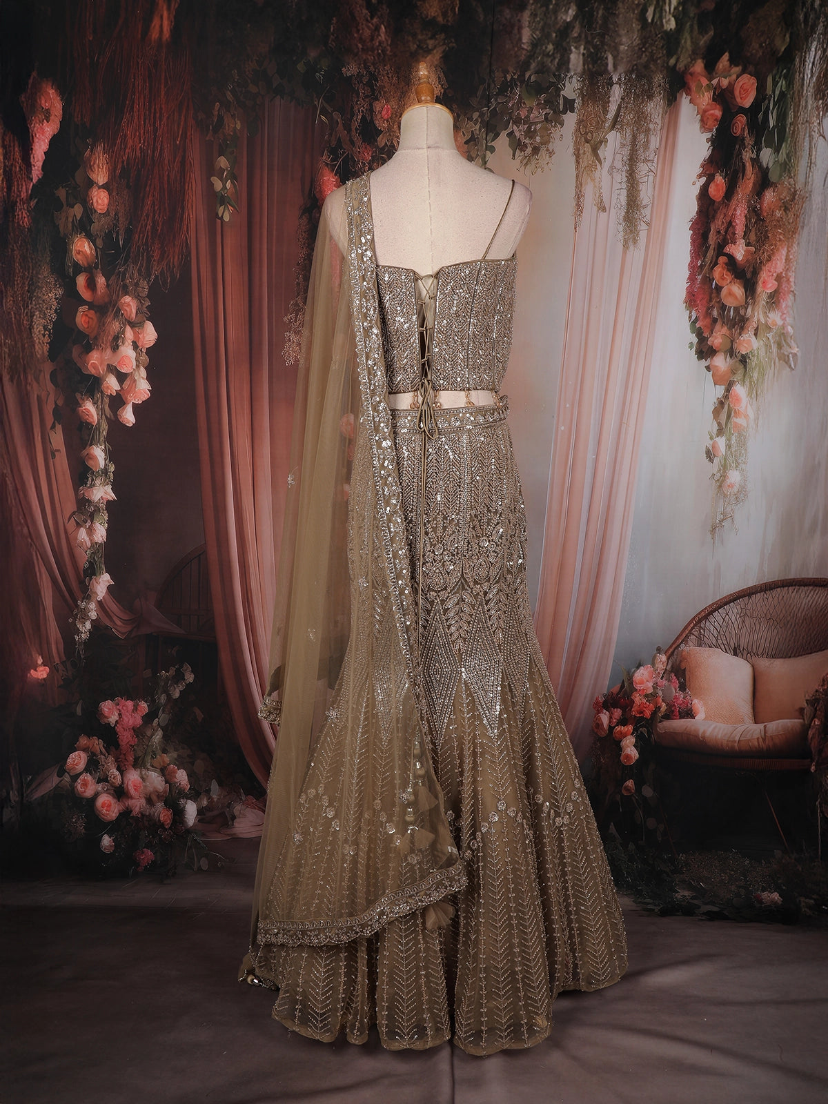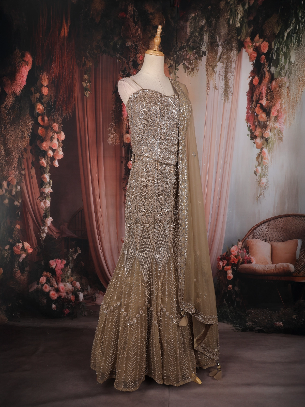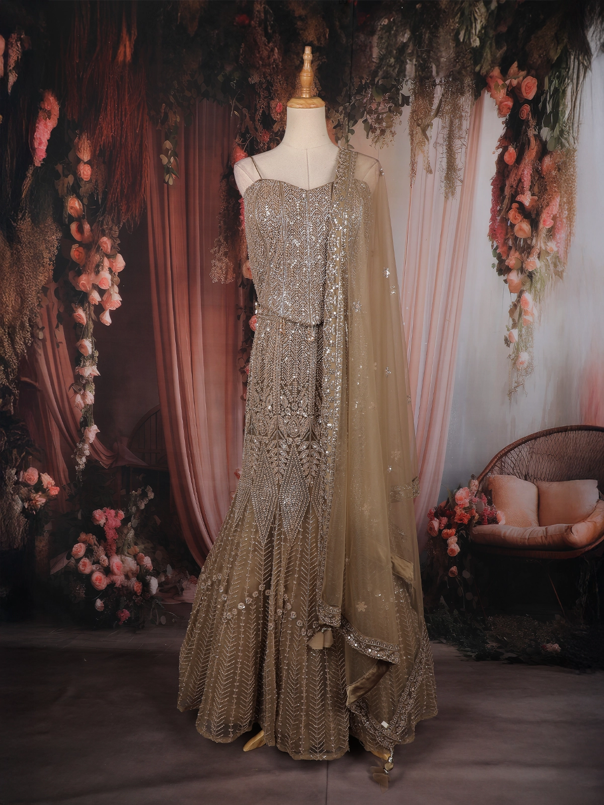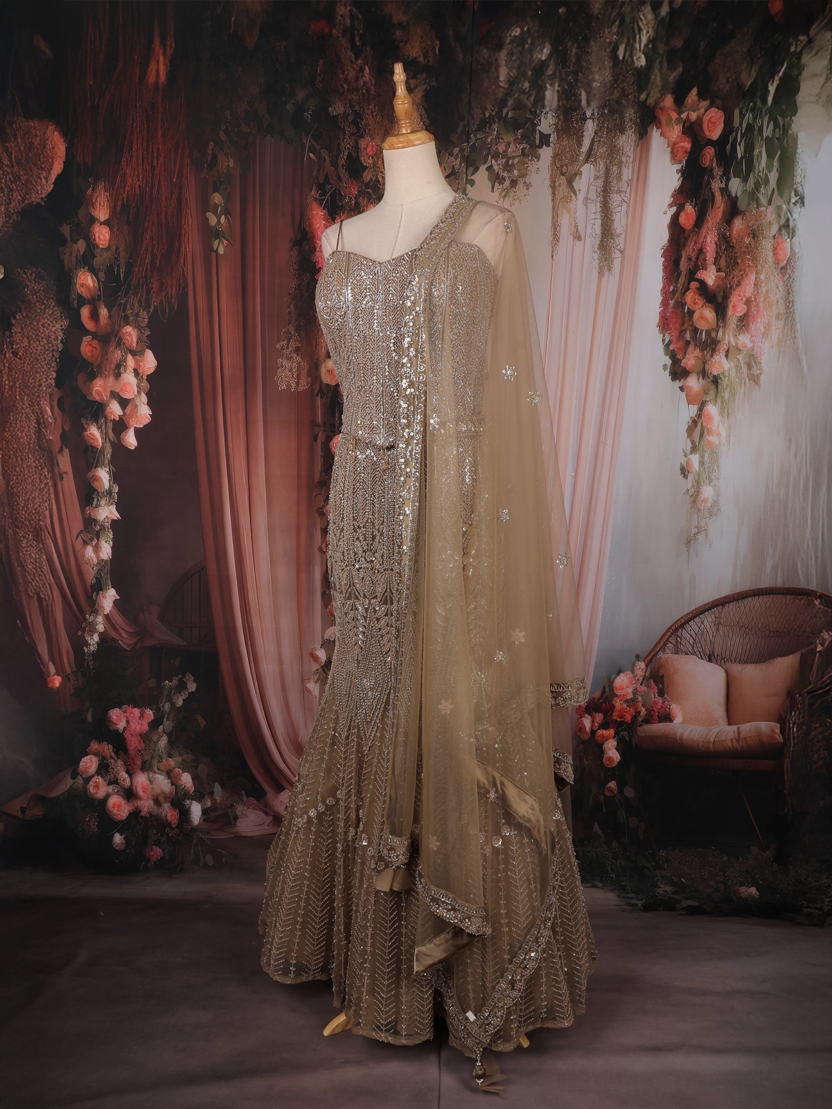 Step into pure luxury with this Champagne Gold Mermaid Net Lehenga, designed to make an unforgettable impression at grand celebrations. Rendered in an elegant champagne gold hue, this ensemble radiates timeless glamour with a couture-inspired finish.