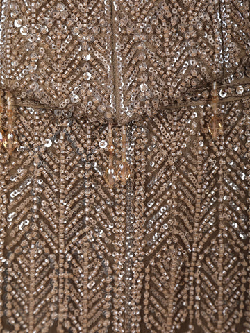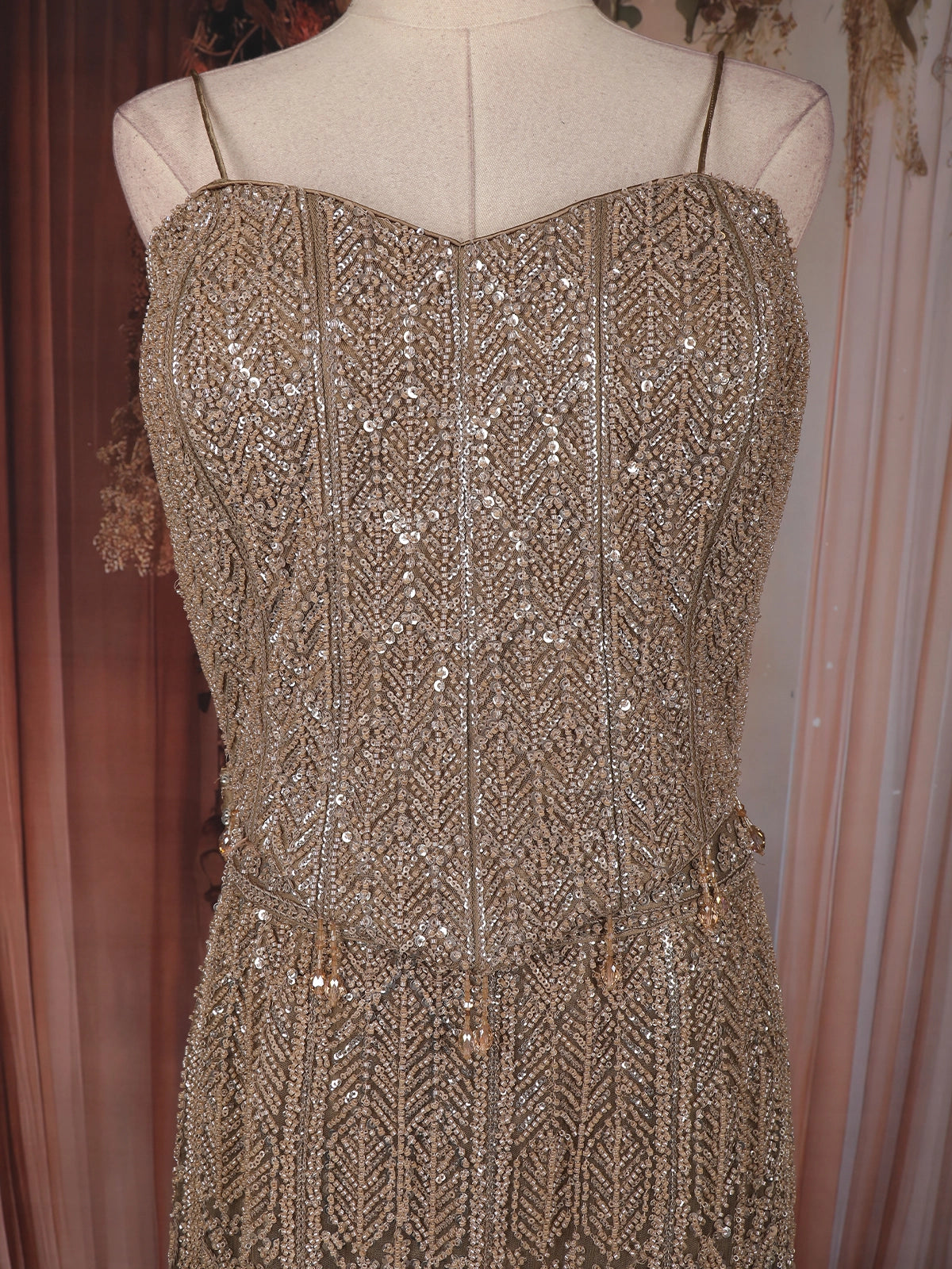 The net blouse is richly embellished with dense sequin, bead, and cutdana embroidery, arranged in intricate geometric and chevron patterns that shimmer beautifully with every movement. Styled with a sweetheart neckline and delicate spaghetti straps, the fitted bodice enhances the silhouette, while fine tassel detailing adds a touch of refined charm.