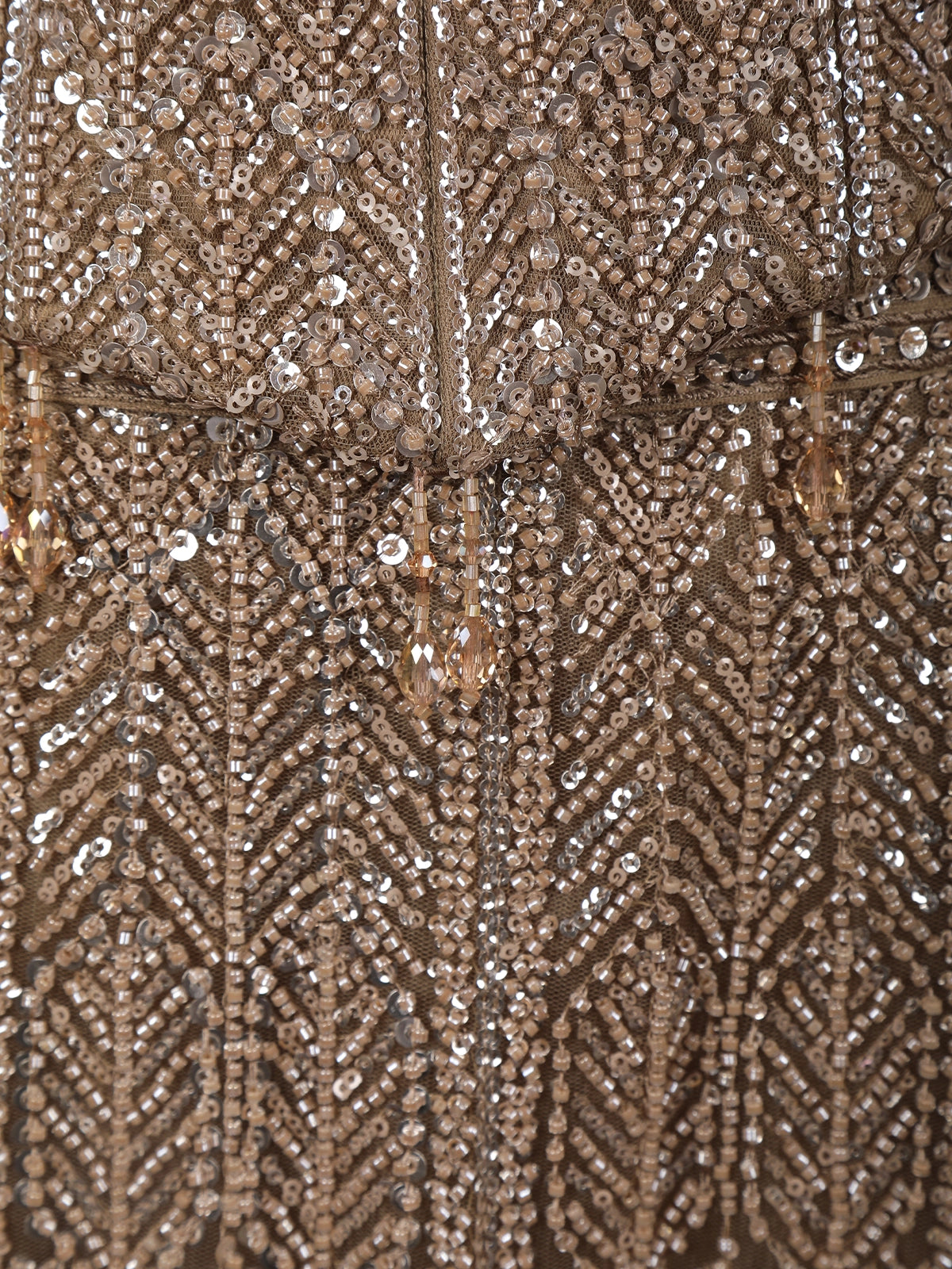 The mermaid-style net lehenga flows gracefully from the knees, creating a dramatic yet elegant flare. Its all-over heavy embroidery lends depth and richness, making it a perfect choice for evening occasions. The ensemble is completed with a sheer net dupatta, delicately embellished to complement the lehenga without overpowering its luxurious appeal.