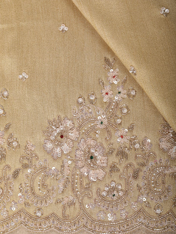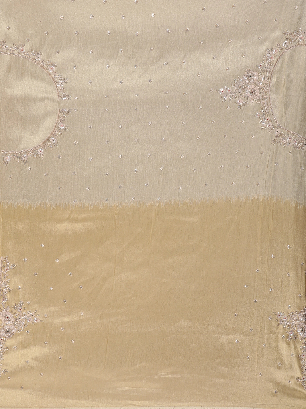 Paired with a matching embroidered blouse fabric, featuring embellished sleeves and neckline detailing, this saree is perfect for weddings, receptions, sangeet nights, and grand celebrations. Its soothing champagne-gold tone flatters every skin tone, making it an instant show-stopper.