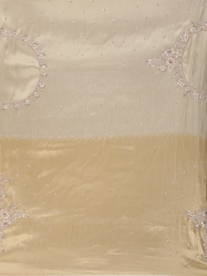 Elevate your celebration wardrobe with this breathtaking Champagne Gold Tissue Banarasi Saree, crafted to exude timeless elegance and luxurious charm. The saree features a soft, luminous satin base that drapes gracefully, highlighting your silhouette with its natural sheen. Delicate sequin, bead and thread embroidery is scattered across the body like tiny twinkling dew drops, adding just the right amount of sparkle.