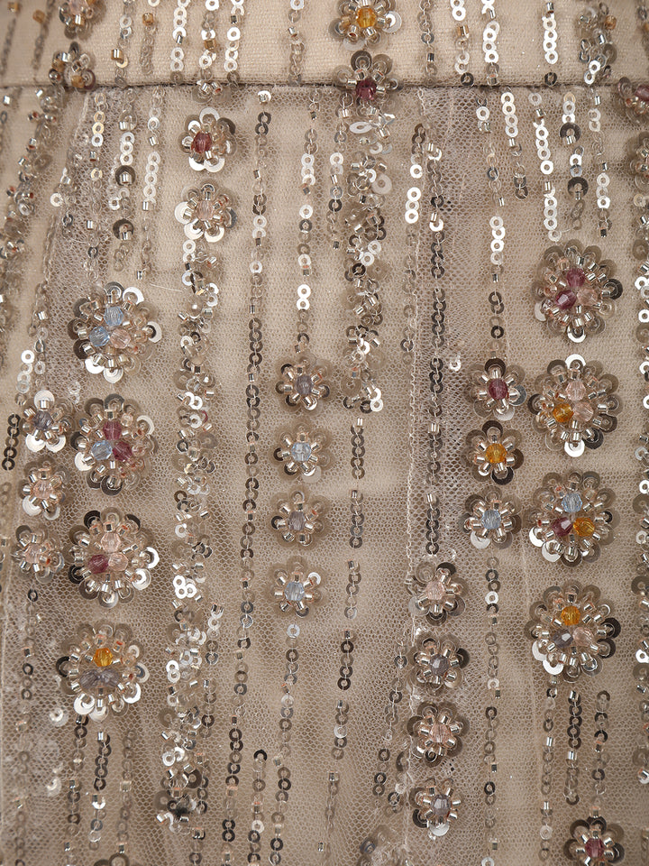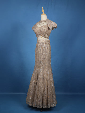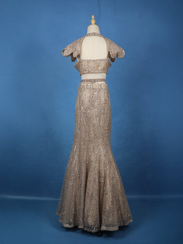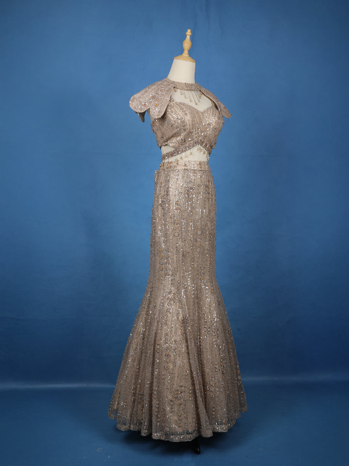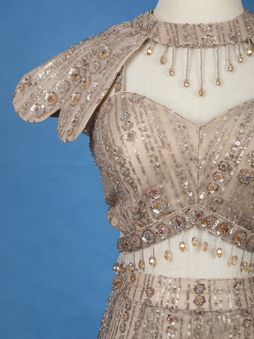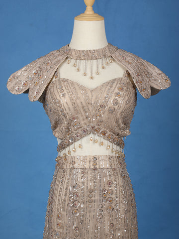 Elevate your evening elegance with this Beige Sequins Embellished Designer Lehenga, a true masterpiece of glamour and craftsmanship. Designed in luxurious net fabric, this ensemble glimmers with all-over sequin embroidery that cascades gracefully down the silhouette, creating a mesmerizing play of light with every movement.