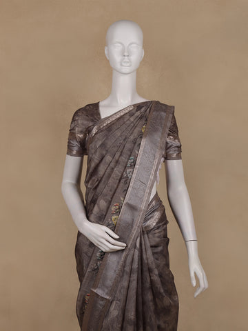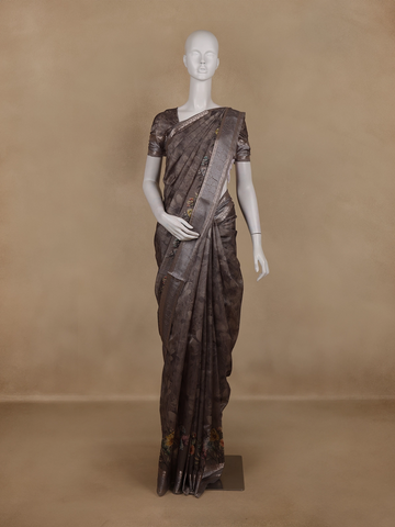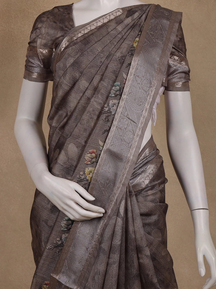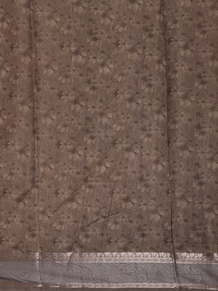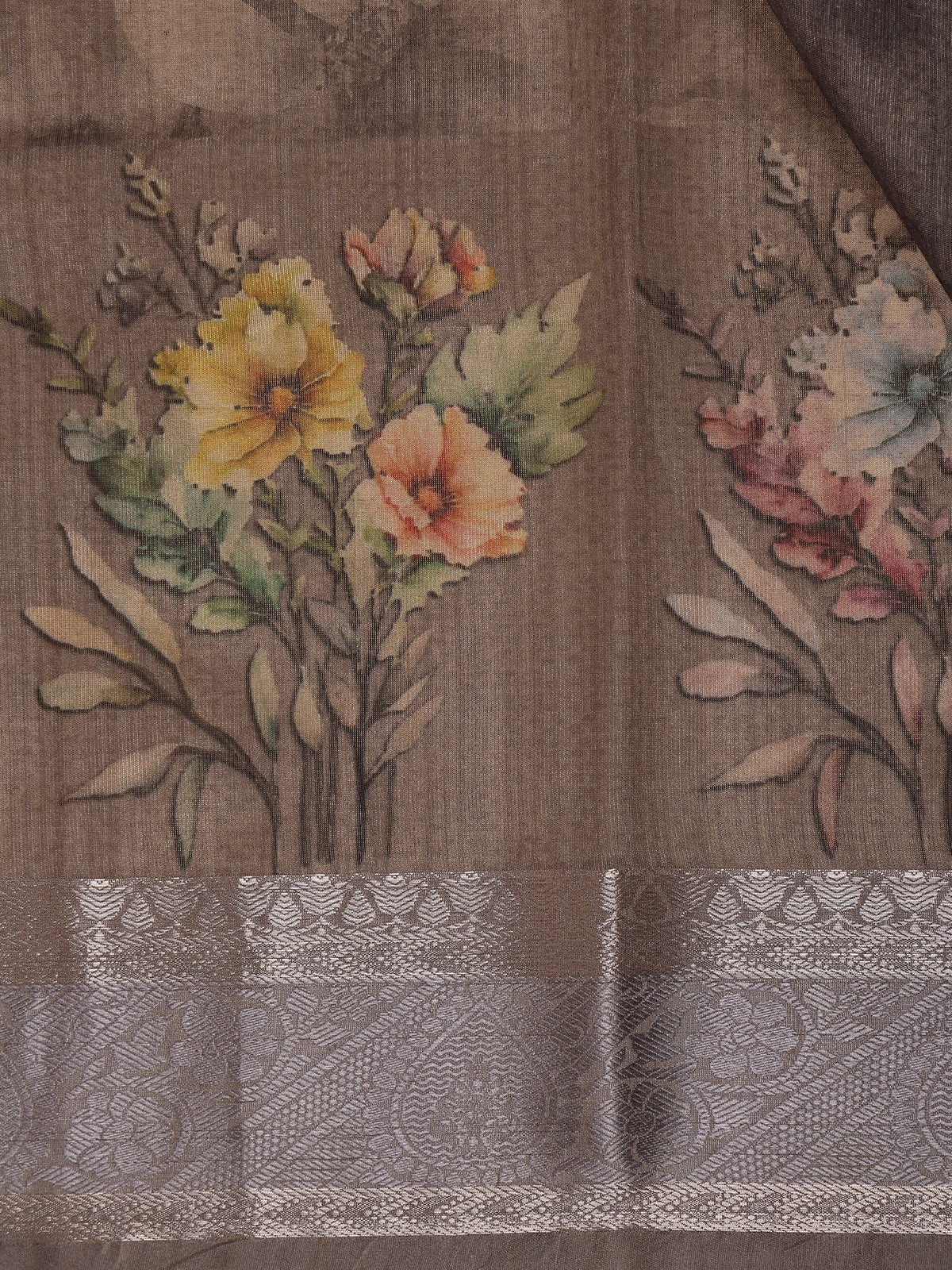 The body of the saree features delicate floral prints that bloom beautifully across the subtle brown backdrop, adding a touch of artistry and femininity. The zari border and pallu enhance its classic appeal with a hint of shimmer, while the matching blouse piece completes the look with effortless coordination.