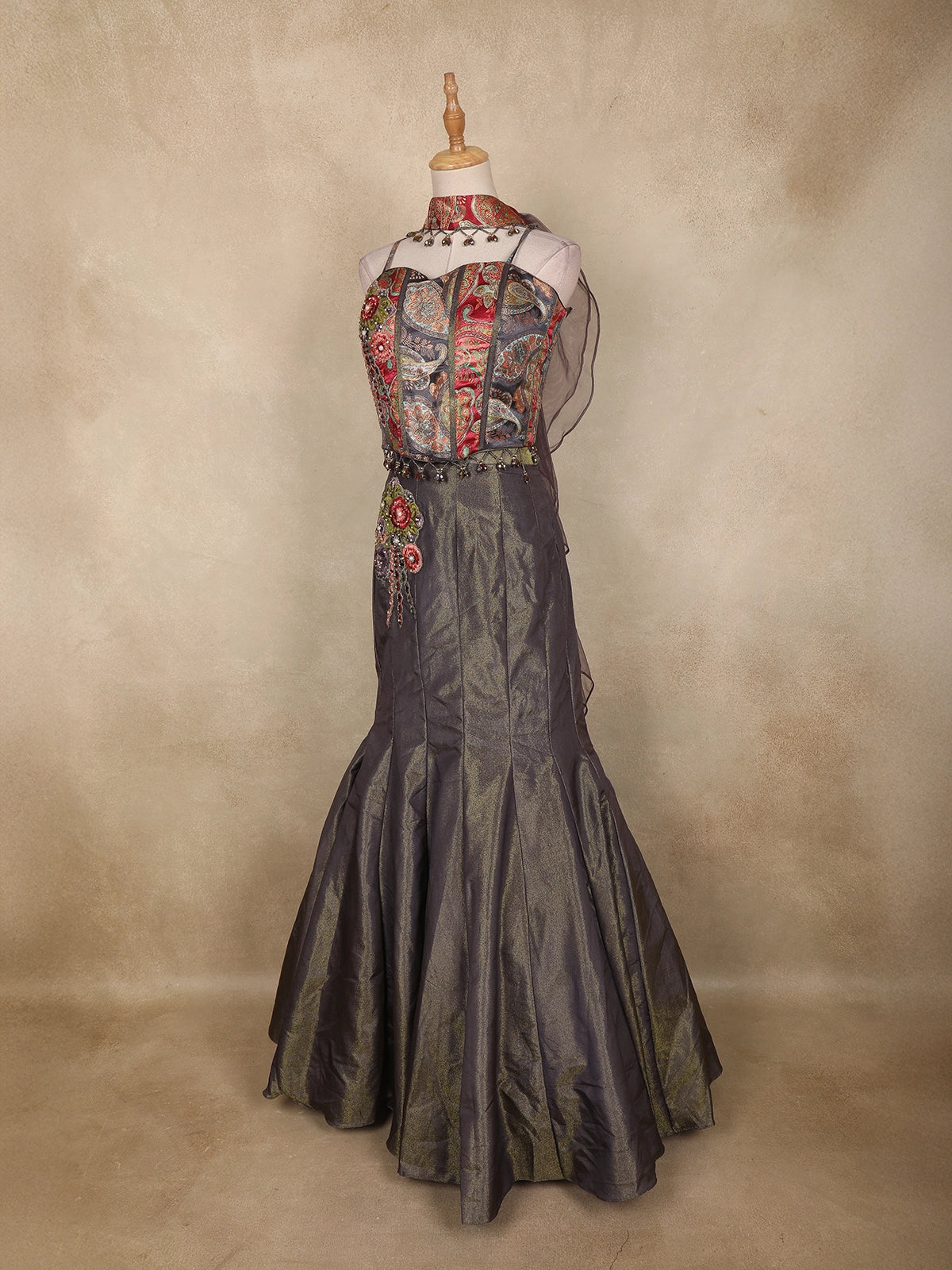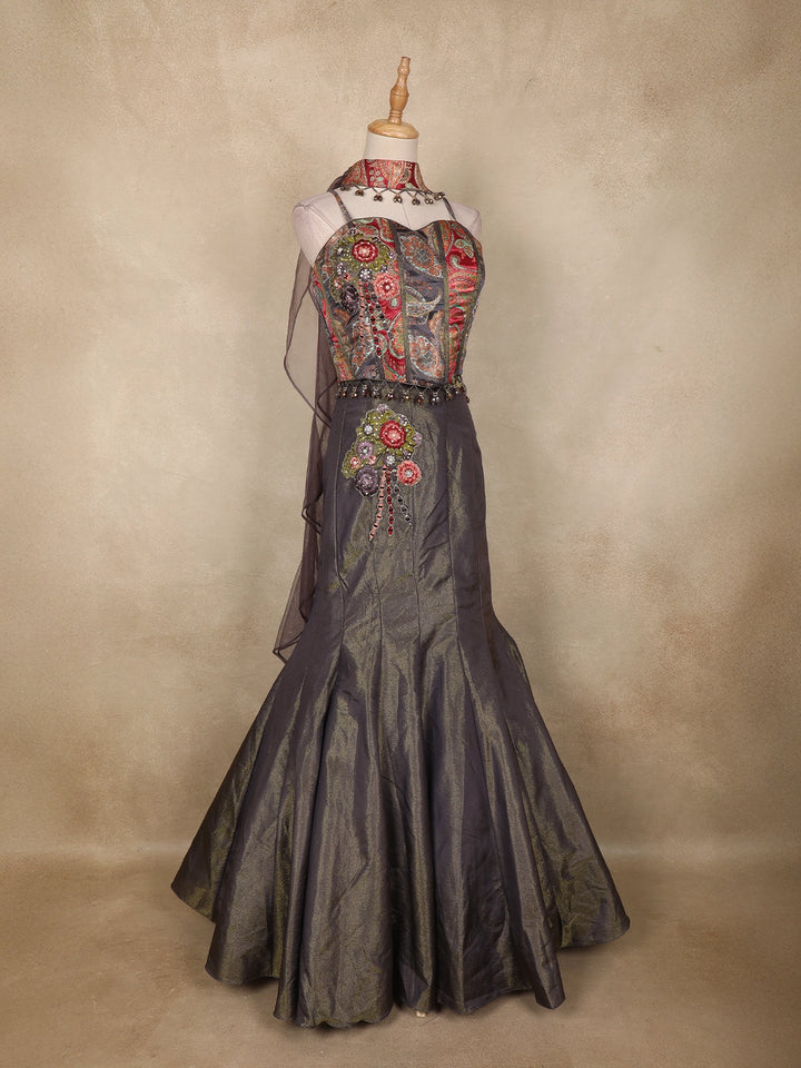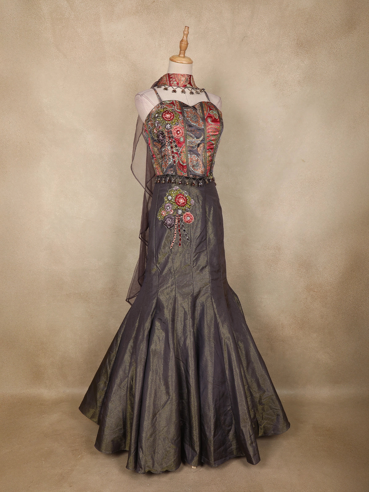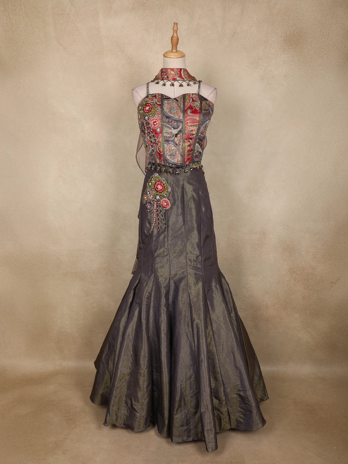 Make a grand entrance with this stunning Indo-Western mermaid style lehenga, designed to bring out your bold and glamorous side. The fitted corset-style bodice features luxurious paisley brocade in rich tones of charcoal grey, red, and green, embellished with floral appliqué, sequins, pearls, and bead detailing.