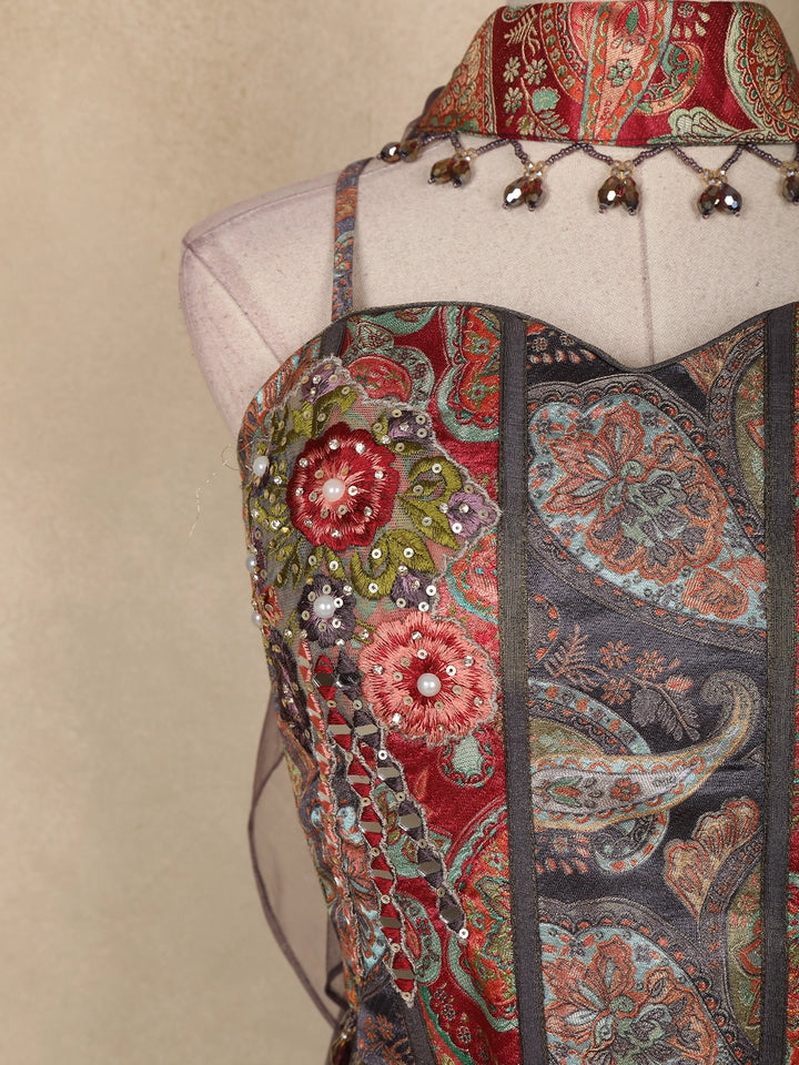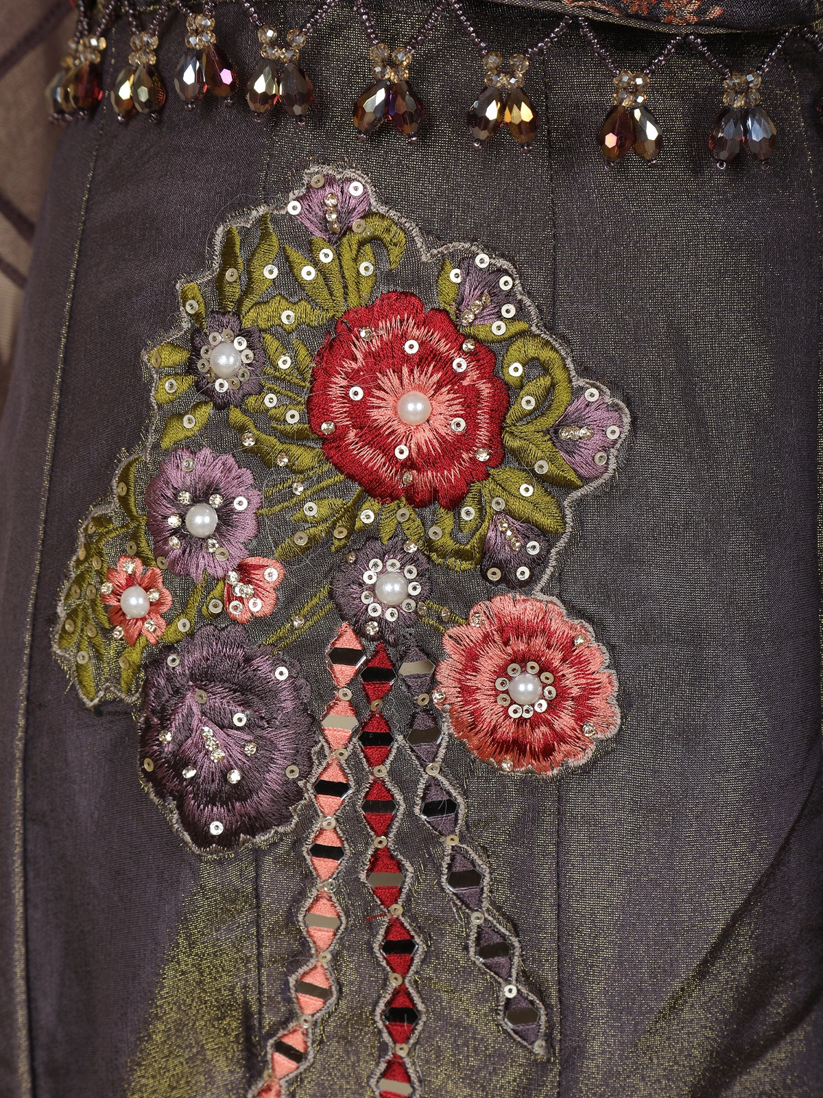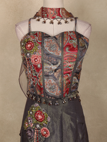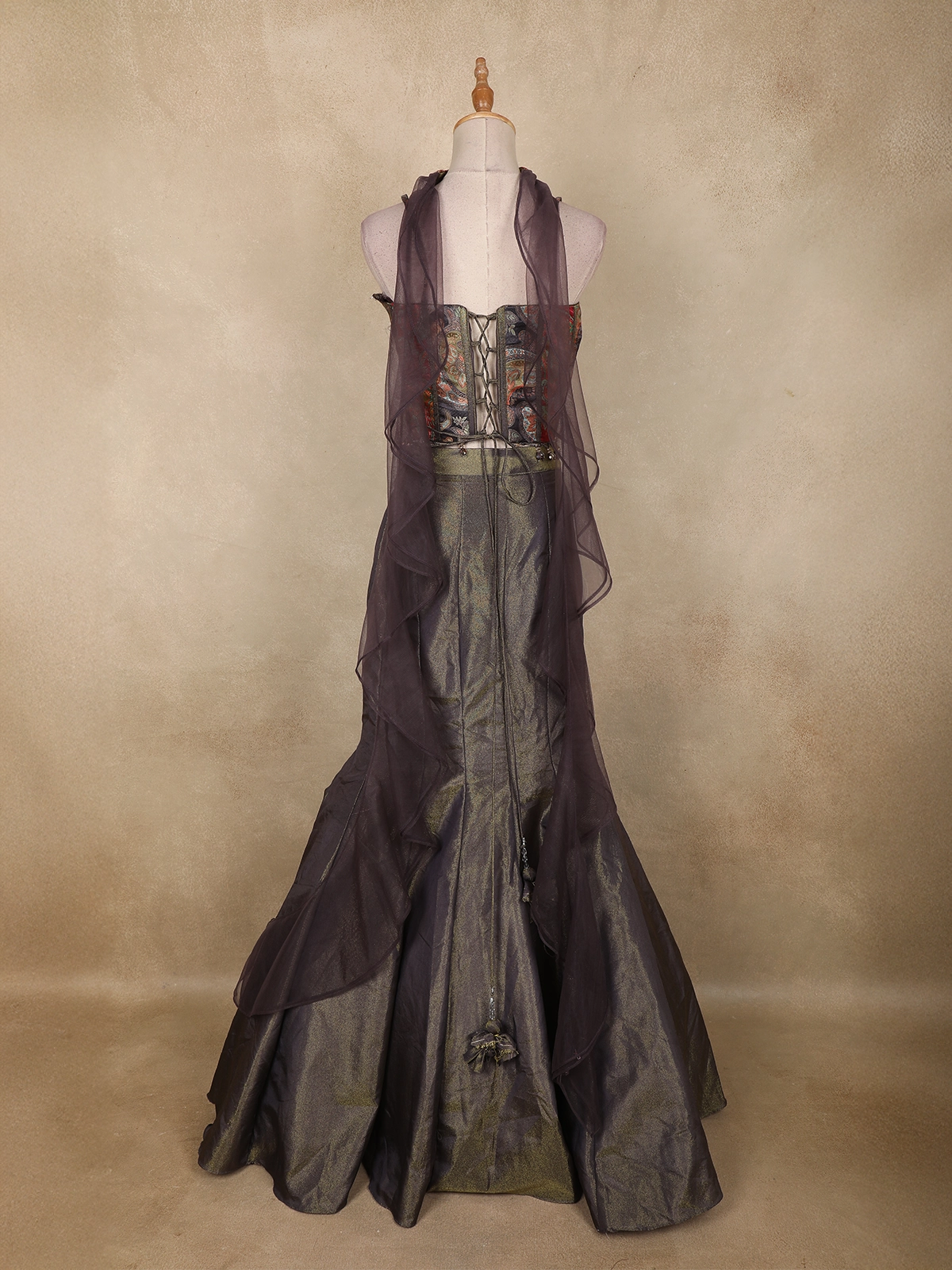 Make a grand entrance with this stunning Indo-Western mermaid style lehenga, designed to bring out your bold and glamorous side. The fitted corset-style bodice features luxurious paisley brocade in rich tones of charcoal grey, red, and green, embellished with floral appliqué, sequins, pearls, and bead detailing.