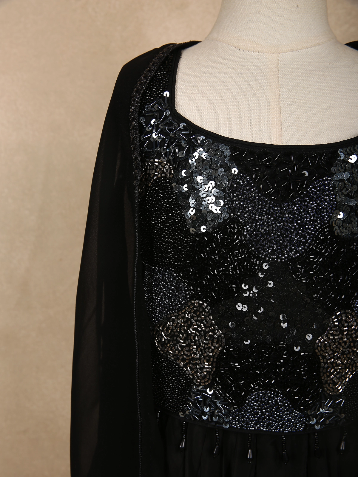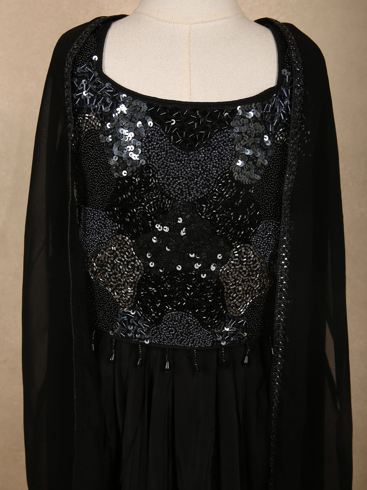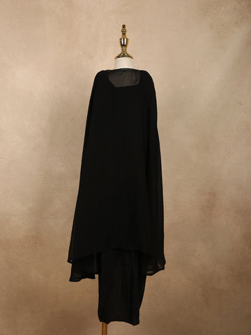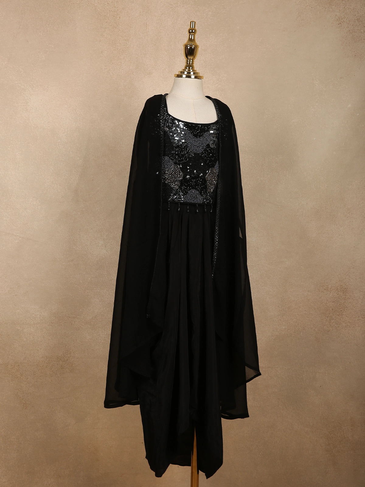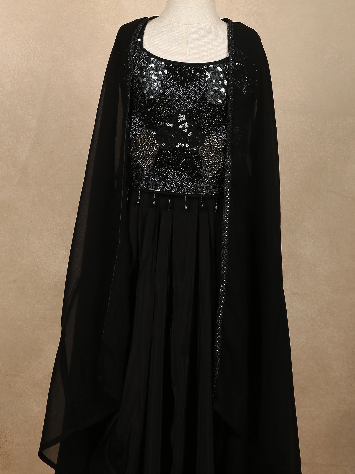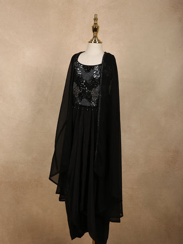 Completing the look is a sheer black georgette cape, designed to fall softly over the shoulders, adding a stylish layered effect and a touch of contemporary flair. The coordinated tones and delicate shimmer create a sophisticated ensemble that feels both festive and age-appropriate.