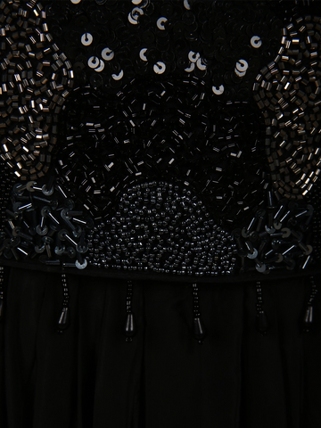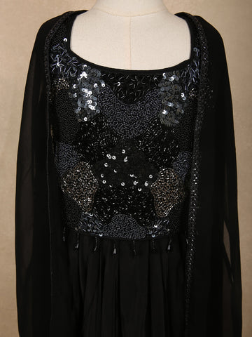Crafted in a deep, timeless black shade, the outfit features a beautifully embellished sequins and beads embroidered crop top that adds a refined sparkle without being overpowering. The intricate floral-inspired embroidery lends a rich, premium finish, making it ideal for special occasions. The flowy georgette skirt drapes gracefully, offering comfort and movement while maintaining a polished silhouette.
