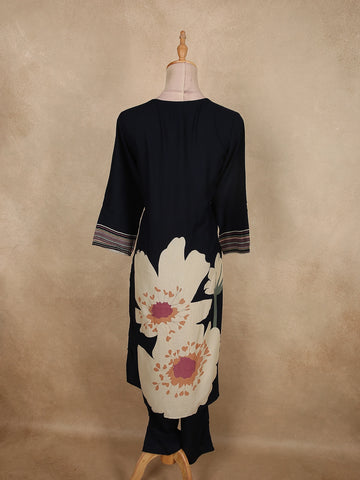 The kurta features a flattering V-neckline highlighted with subtle stud detailing, lending a hint of understated glamour. Three-quarter sleeves are finished with contrast striped borders, adding a refined design element that enhances the overall look. The knee-length straight-cut kurta pairs seamlessly with matching solid black straight pants, offering a clean and structured finish.